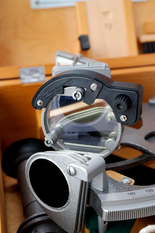 The sextant was supplied with two telescopes of exceptional quality, probably by Zeiss. The inverting telescope, a 6 X 30, was identical to that supplied with the SNO-M, while the Galilean star ‘scope was a 4 X 40. There was also a kit of extras, comprising a spare (front-surface) index mirror, a cleaning brush, an oil bottle, two screwdrivers, two sighting vanes, a pin wrench to adjust the micrometer drum and a mirror adjusting wrench. The instrument itself weighed 1.5 kg. This very high quality sextant, possibly the best ever made, was let down by being contained in a grey-painted pinewood box and restrained in poorly engineered wooden pockets which were prone to disintegrate in transport. However, when the paint is stripped off and the wood stained and polished the result is very attractive. Currently selling for around US$400, this represents to my mind a substantial undervaluing.