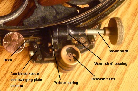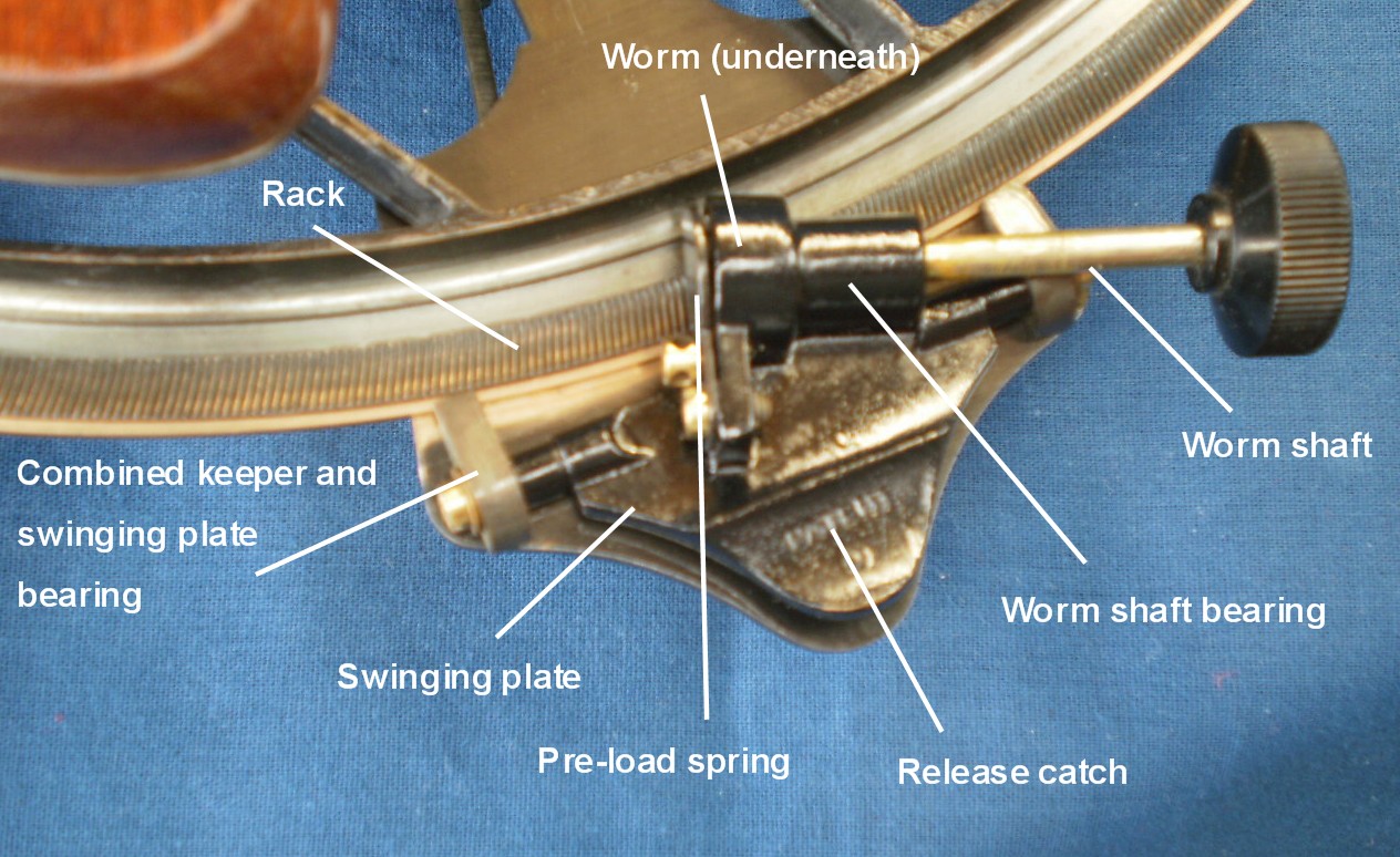 There is a finely skew-cut rack on the back of the limb, with which a worm engages. The worm runs in bearings on a swinging plate between two centres, so that it can be swung out of engagement with the rack against pressure, by squeezing two knobs between finger and thumb. A helical spring between the knobs keeps the worm in engagement. A leaf spring provides axial preload to eliminate end-float of the worm spindle (Figure 5)