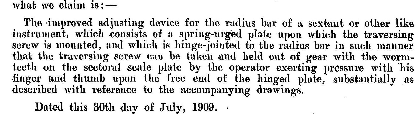 In about 1909 Heath and Co. introduced their “Hezzanith endless tangent screw automatic clamp” which incorporated all the elements of a micrometer sextant but without a micrometer drum. It allowed rapid positioning of the index arm followed by fine adjustment, but the readout was still from a vernier main scale. The patent document concluded:
