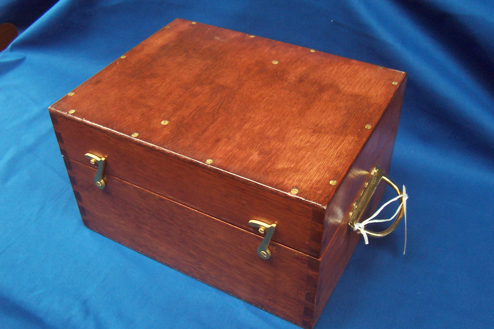 The sextant came to me without a case, so my first step in its restoration was to make a new case for it. I used the tropical hardwood, kwila, for the carcase and sapele, sometimes called African mahogany, for the internal fittings. I followed Hughes’s practice of placing the handle on the side of the box, so that it can be set down without damaging the hinges, and of arranging the latch hooks both to point to the floor when the case is being carried. The joints are box dovetails, not a 1950’s practice, at which time comb joints were the norm.