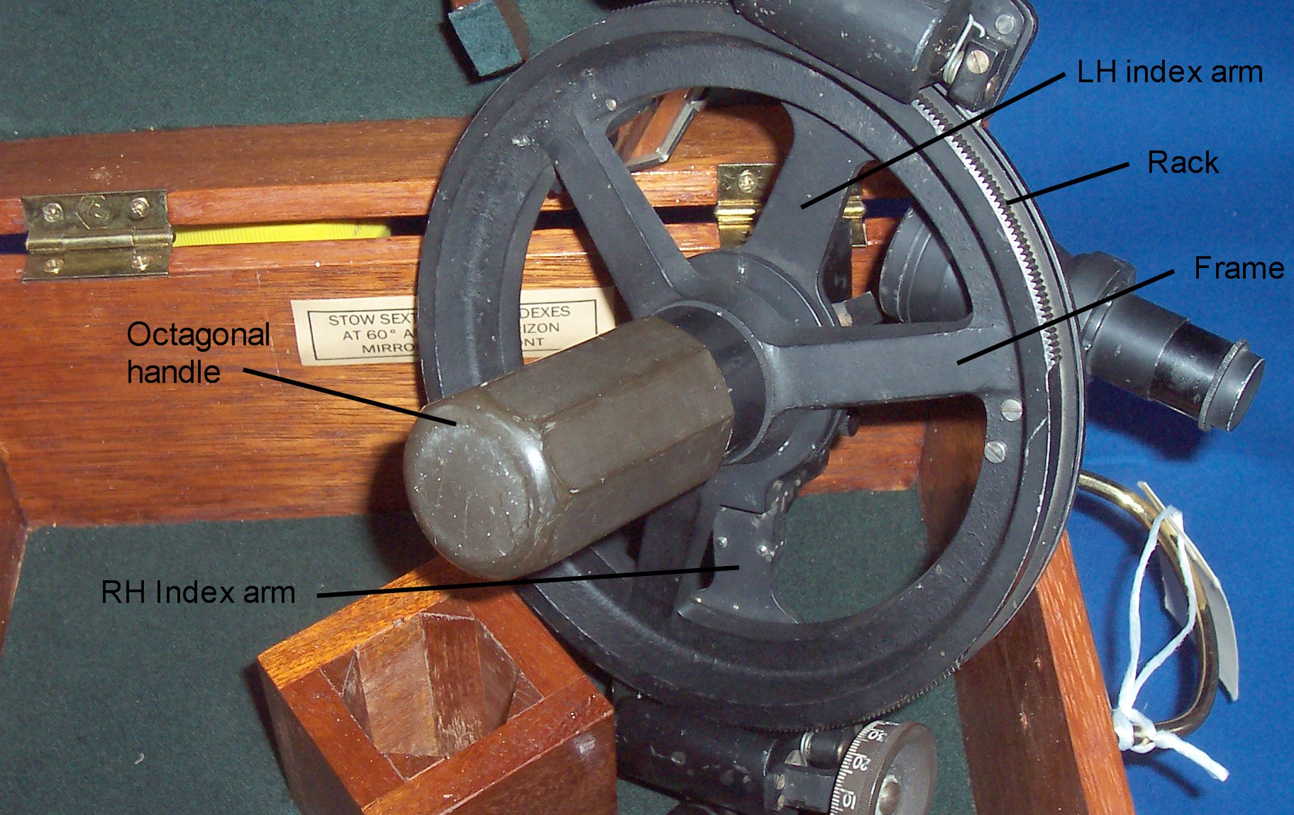 The aluminium alloy frame of about 86 mm radius is in the form of a three spoked annulus with two lengths of rack on the periphery, and is held in the hand by means of an octagonal plastic handle that screws into the hub. The worms of two micrometers at the end of alloy index arms engage with the racks. The zeros of the scales of degrees are set 140 degrees apart. The narrow mirror of each index arm rotates independently about the centre of the instrument and the x2 by 30 mm Galilean telescope looks past their left hand edges at the middle mirror, which is about 35 mm square. This is unsilvered in a middle horizontal strip, so that the user has a direct view of the central object and reflected views of the right and left-hand objects. The mirrors are provided with adjusting screws which have screw-on protective caps. The next photograph shows the layout, with the index mirrors set at micrometer readings of 60 degrees.