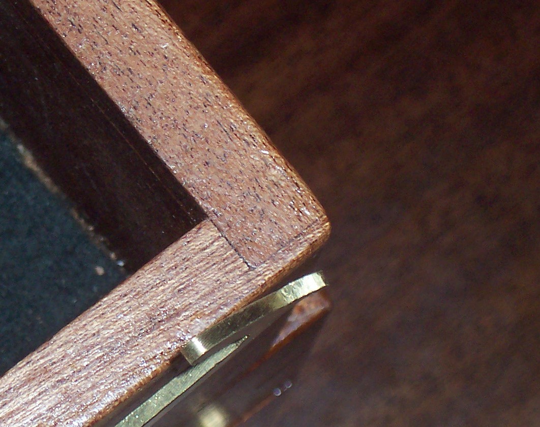 Making the case from African mahogany needed only normally careful woodworking. Dovetail joints for the corners had by the 1920s given way to comb (finger) joints, but as some later American aircraft cases used corner rebates, which are much easier to make without special machinery, this is what I used, with brass pins across the joints to prevent disaster if the very strong glue should fail: