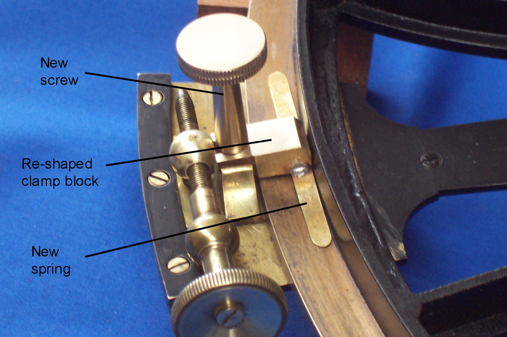 The new clamp screw was a fairly straightforward bit of turning and knurling, except for the thread which had to be 5/32 inch Whitworth. I went metric over twenty years ago and my odds and ends of Imperial screwing tackle do not include 5/32 x 32 tpi, so I had to screwcut it in the lathe. The clamp itself also needed attention, as it did not have a spring (and was the wrong size and shape anyway). I filed it to a somewhat better shape and made a new spring by hammering a sliver of sheet brass until it work-hardened and became springy, a trick that would have been well-known to C18 and C19 clockmakers. You can just see in the next picture traces of the solder that hold the spring to the clamp .