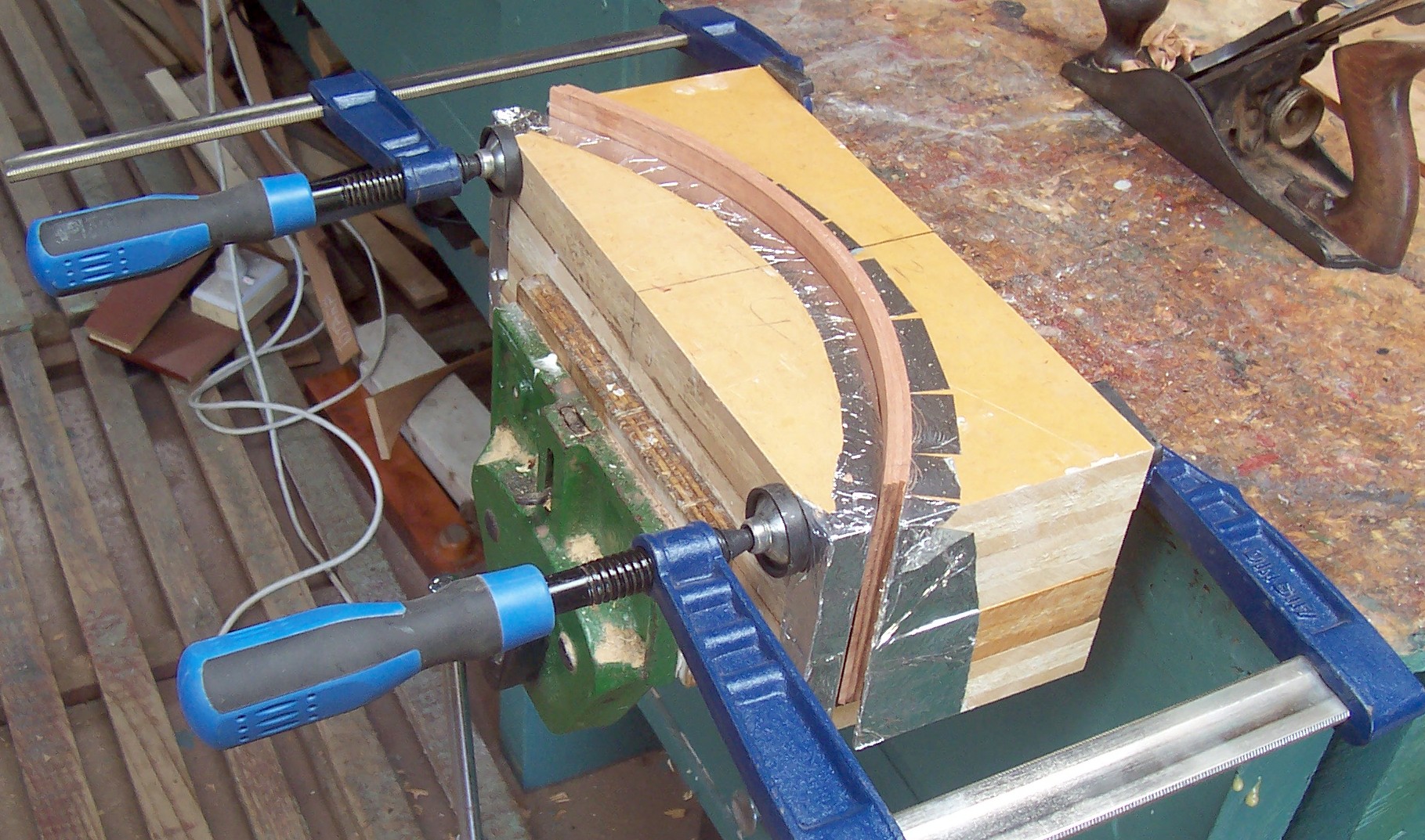 Having a 50 mm plank of Sapele (an African wood similar to mahogany) reduced to three 10 mm planks had left me with some of only 2.6 mm thick, so I tried steaming these and then clamping them in a mould while they cooled down. The mould is made from slices of thick tri-board board cut to (nearly) the same shape and glued together, with aluminium foil glued to the surfaces to protect them from the steam and water. It took quite a while to smooth the large concave surface to shape with a spokeshave, so long in fact that I contemplated buying a compass plane – until I discovered the price. The convex surface was large enough to make attack with a bench plane quite feasible.