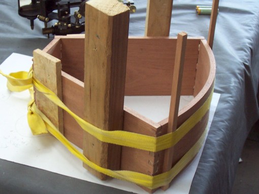 The rear corners are at an obtuse angle and I relied on my model case to give me the angles to mark out the dovetails. Sometimes my saw went a cut too far, but I was able to disguise this with mahogany paste after gluing the bits together. Clamping them cannot be done with any clamp that I possess, so I resorted to the old trick of using webbing. The blocks of scrap wood seen in the next photo serve the dual purpose of tightening the webbing as they are slid towards the corners as well as concentrating the clamping force near the corners. It is best to sit the carcase on a flat surface and “persuade ” it to sit flat before the glue dries. A sextant can be seen in the background, watching its new home being built.