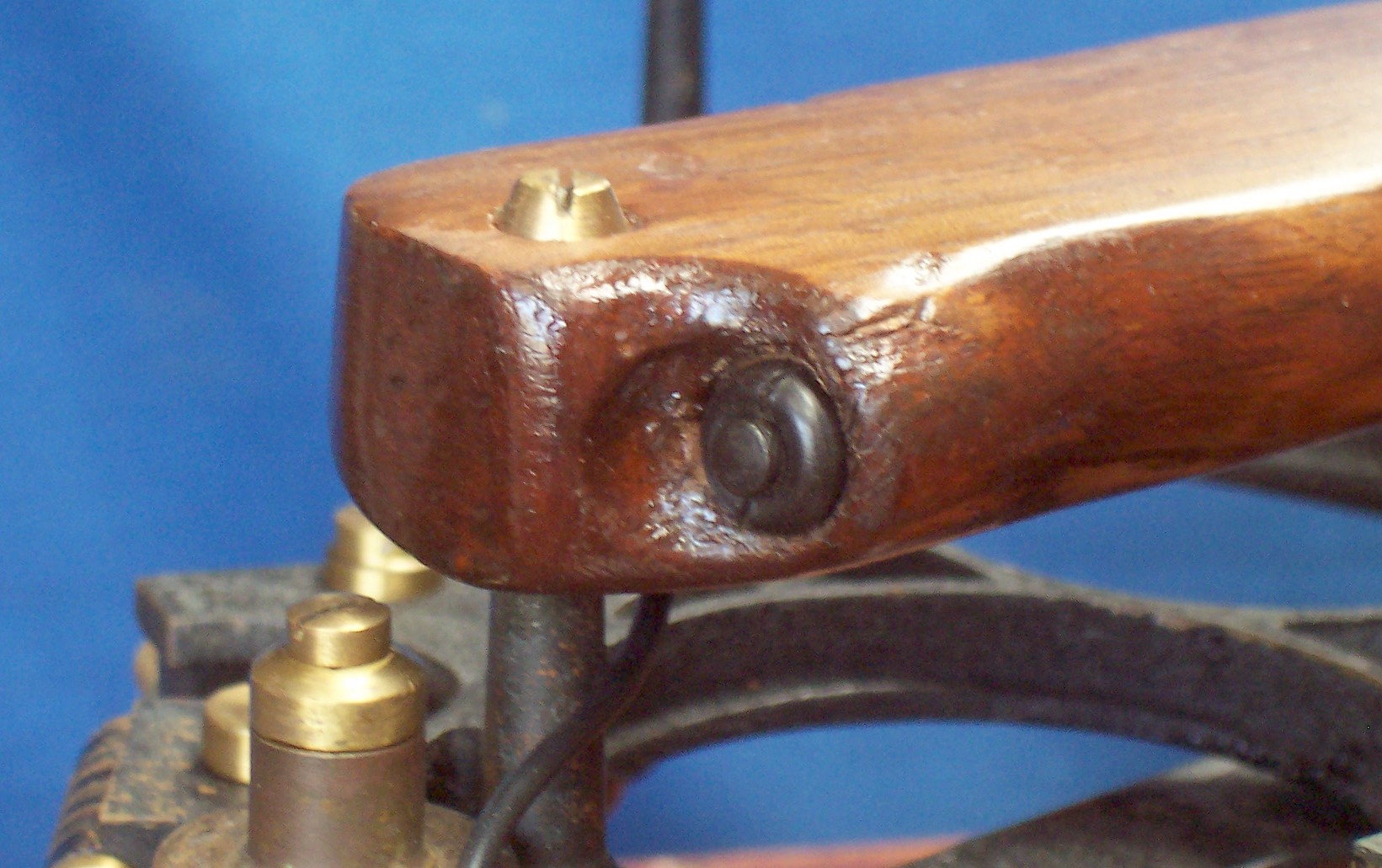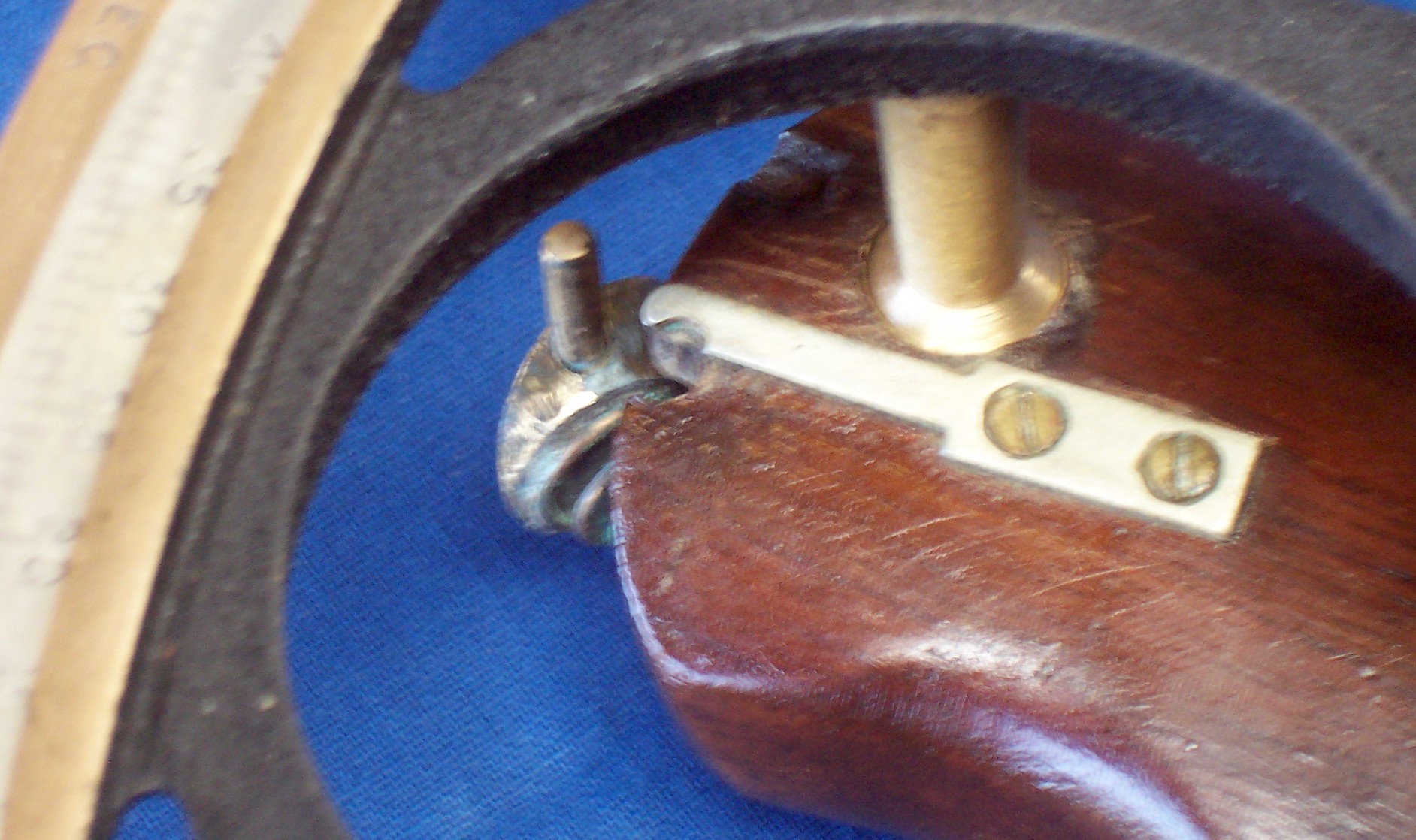 Hughes and Son at this time (1938) used a wrinkle finish paint on these parts, with a black lacquer for most of the others. The advantage of such paint is that it hides any minor blemishes in the finish of the underlying metal, it is not distractingly glossy and, having been baked on, it is reasonably tough. However, it had not withstood immersion in sea water very well. Happily, modern paint technology allows us to get the same finish without baking. I use PJH brand “VHT Wrinkle Plus” spray paint and find it gives a very good result. The wrinkles can be made tighter by heating with a hot air gun as the paint begins to dry and before the wrinkles have started to form. The next picture shows the finish I obtained, and it is quite close to the original (I have other Hughes sextants with which to compare it).