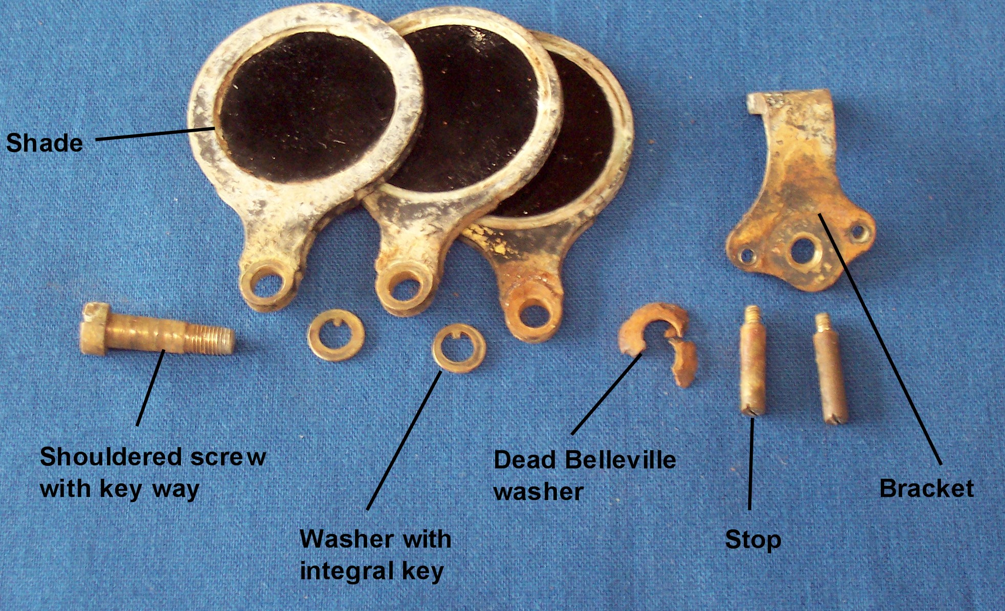 Although the wrinkle paint appears to dry quickly, it is very easy to damage it, and, as a full cure takes five days, I moved on to some parts that I knew would take care and time to restore: the shades assemblies. I started with the easier horizon shades. These are mounted on to a bracket by means of a shouldered screw and locknut and separated from each other by washers. The washers have integral keys that engage with a keyway on the screw so that they cannot rotate. This ensures that when one shade is rotated, the others do not follow. Some resistance is applied by means of a Belleville washer, a dome-shaped washer that behaves as a short, stiff spring. You will see from the next photograph that the Belleville washer had not survived.
