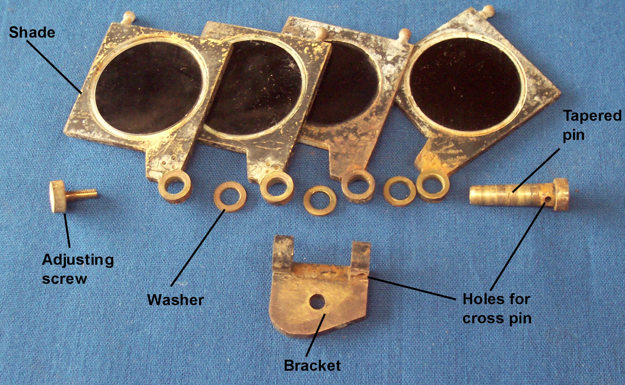 There are some tricks to remounting the index shades. It is best to have a trial mounting on the pin, to make sure that you have the shades and washers in the correct order and the right way around. The cross pin is not usually exactly on a diameter and will usually fit only one way round, so make some sort of mark on the head of the tapered pin and bracket to indicate the correct orientation. Then lay the parts in order on the bench while you grease the tapered pin and place a tiny dab of grease on each face of the washers. You can then reassemble them on the pin and remove the pin without everything dropping apart. With the shades and washers on the pin, wangle them between the cheeks of the bracket (the right way around, of course). Once they are partially engaged with the bracket, you can withdraw the pin and carefully engage them further until the narrow end of the pin can be re-entered through the bracket, waggling the shades a little so that the pin passes deeper and deeper into the composite tapered hole. Make sure the cross hole lines up correctly and then press the head of the tapered pin home. Insert the cross pin, adjust the adjusting screw and you are home.