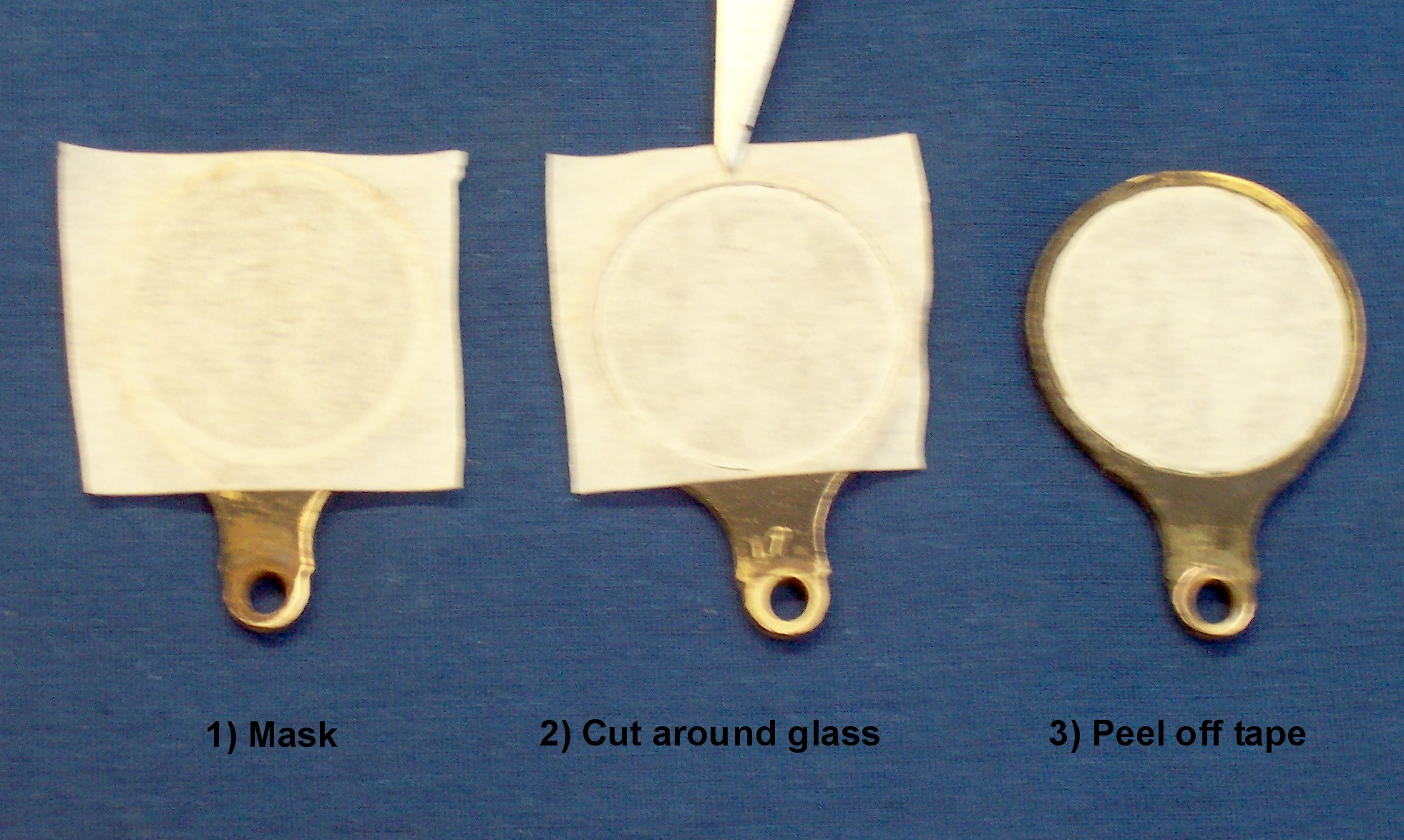 As most of the paint had deteriorated to a mixture of paint and verdigris, I completed the destruction with wet emery paper prior to repainting. In the past, I have done the painting by hand, but as spray painting gives a much better appearance, I worked out a simple way to mask the glass, one that does not attempt the near-impossible of punching out large discs of masking tape. The next photo shows the steps. The knife has to be sharp and have a fine point to be able to follow the curves.