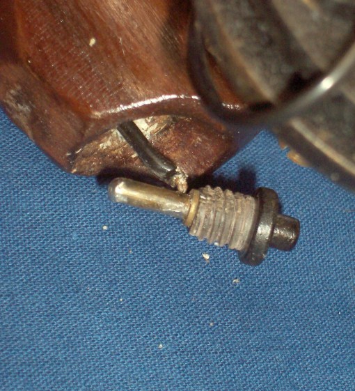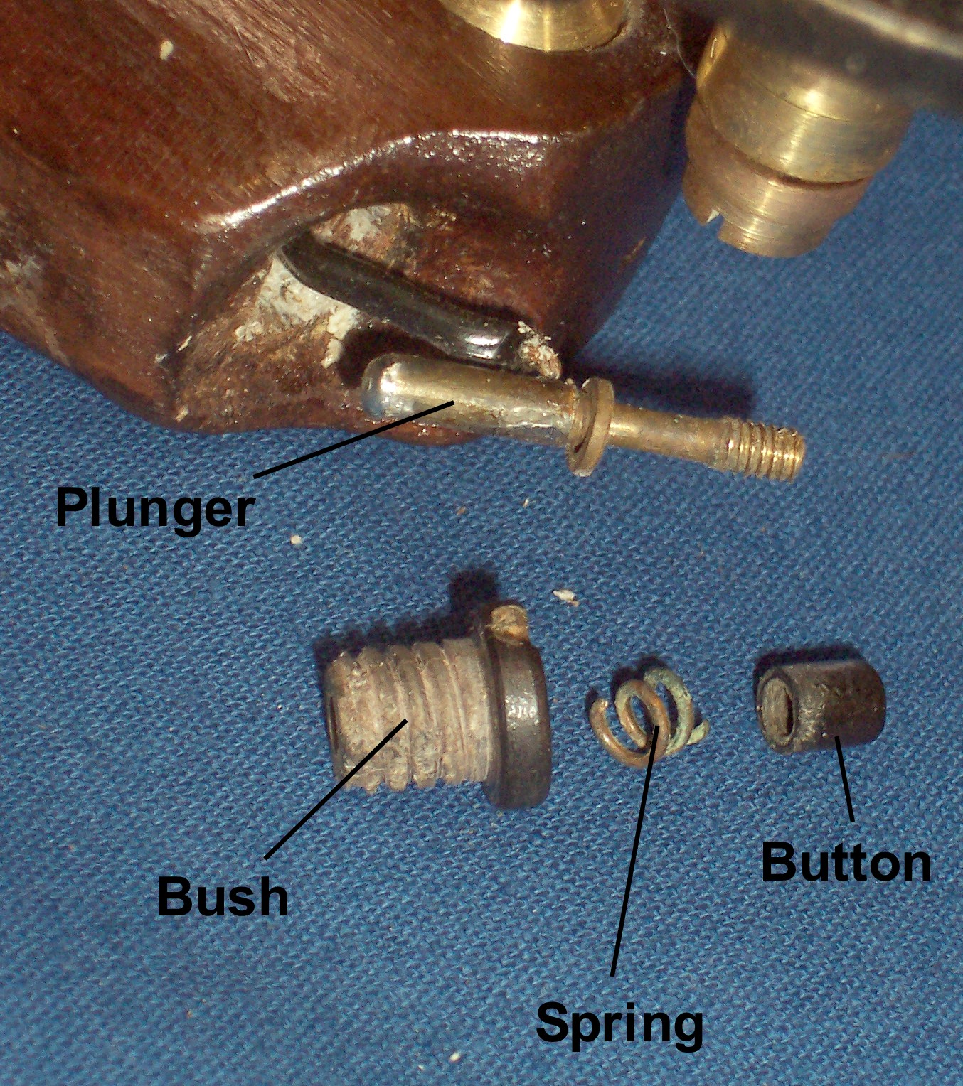 The index shades assembly uses a much older system. The shades and their separating washers together form a tapered hole. A tapered pin passes through the mounting bracket and through the shades and washers, which must therefore be assembled the correct way around and in the correct order. An adjusting screw forces the pin further into the composite hole to adjust resistance to rotation. The tapered pin is prevented from rotating in the bracket by means of a cross pin. Any attempts to remove the tapered pin without first removing this cross pin are doomed to failure, so look for it carefully and punch it out. There are other ways to prevent rotation of the pin and I cover these in my book. Once the cross pin has been removed, brute force in the shape of a wooden drift and press or hammer may be needed to force the tapered pin free. The next photo shows the result.