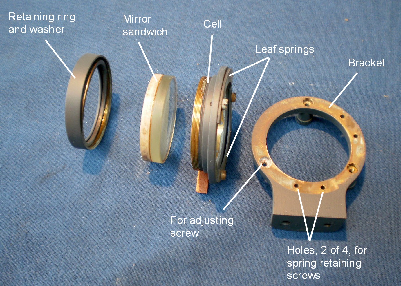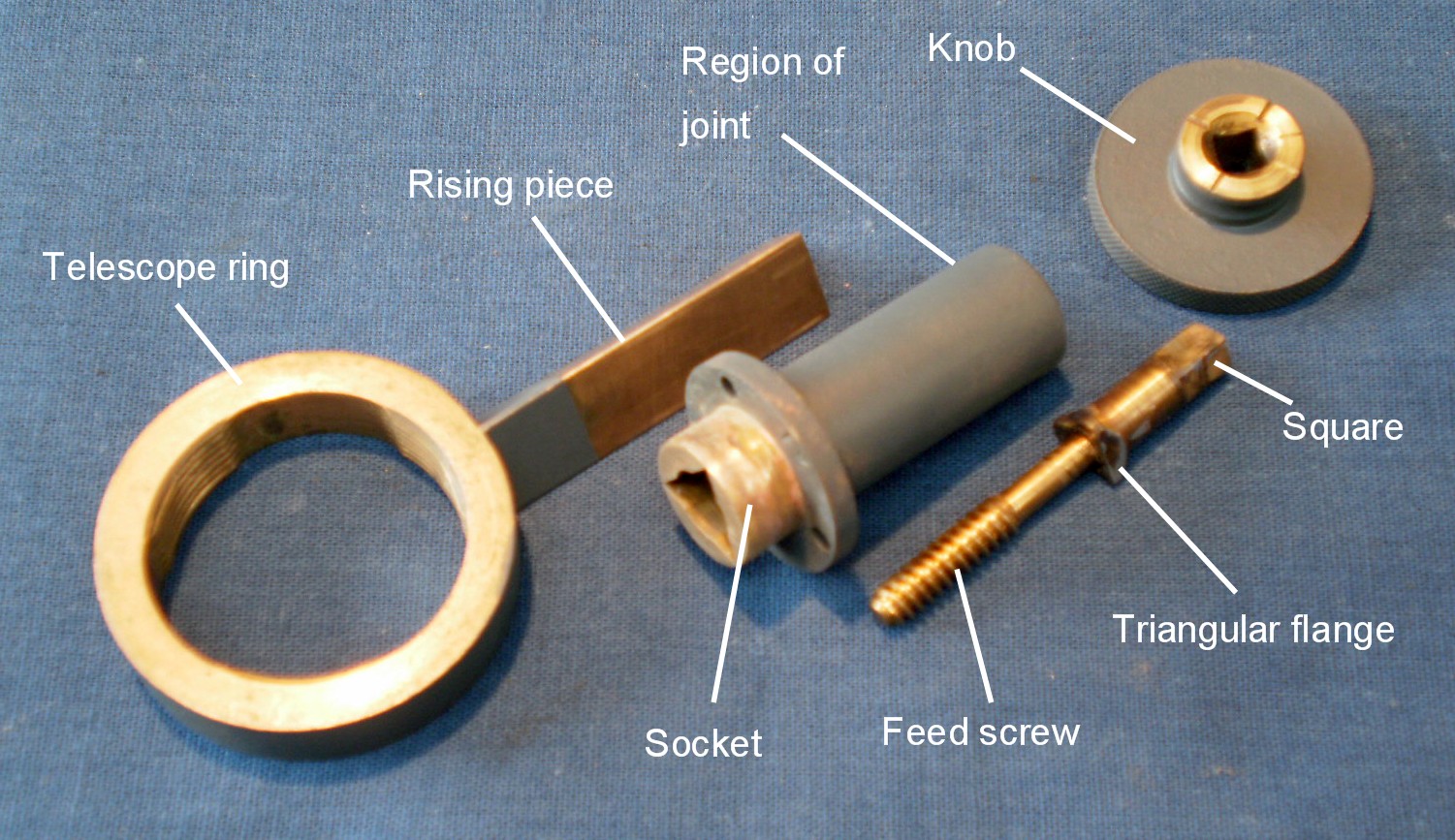 The screws themselves are standard M2 screws with squared heads. They pass through split collets that are threaded on the outside and which screw into bosses projecting from the back of the mirror mountings. Each collet has a tapered tip that fits into a matching female taper at the bottom of the boss, so that when the collet is tightened, it closes up around the screw, thus increasing the resistance to the screw’s rotation or locking it if required (Figure 9). There is a clearance hole through the mirror bracket for the screw