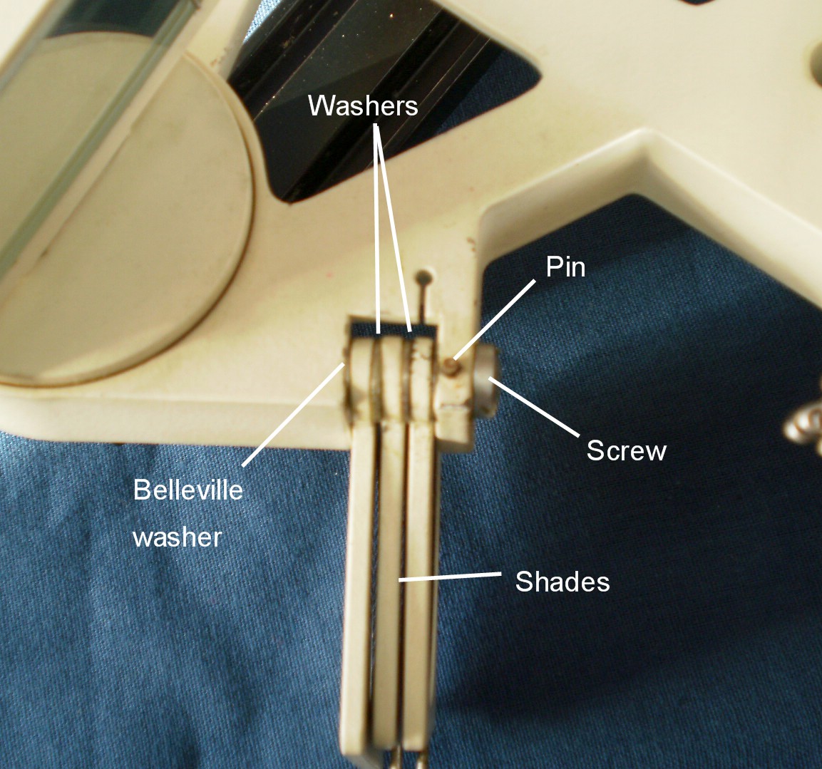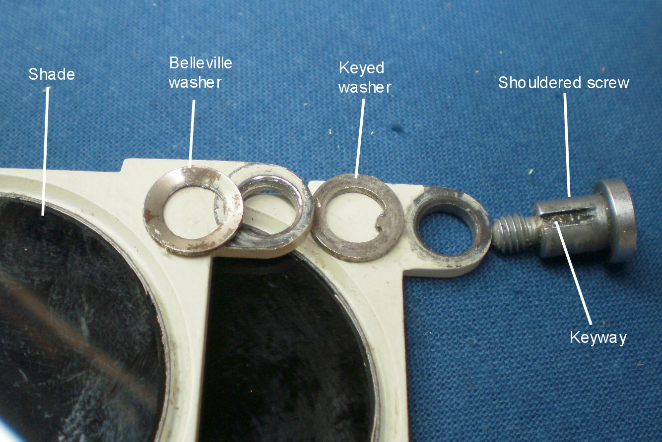 They are mounted on a screw that has a longitudinal key way machined in it. The screw passes through a narrow tongue of the frame, through the shades and separating washers, through a Belleville washer (a washer having the characteristics of a short, stiff spring) and finally into the body of the frame. The separating washers have an integral tongue that fits into the keyway, so that forces from the rotation of one shade cannot be transmitted to the next. The Belleville washer provides enough friction for the shades to stay in the positions in which they are put. It might be thought that the friction could be varied by tightening the screw, but a transverse steel (!) taper pin prevents it from rotating. Driving it out places at risk the slender tongue of the frame which would pose great problems to replace it, if broken off.