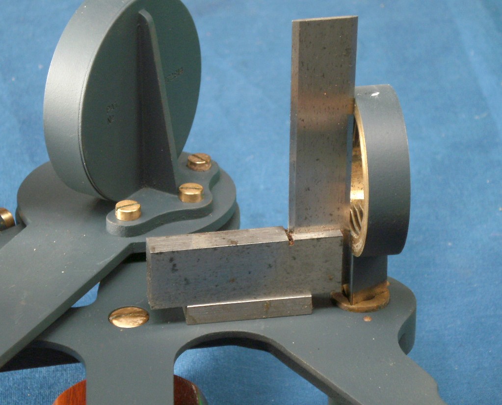 The two horizon shades are mounted on a shouldered screw which also has a keyway and the separating washer also has a tongue that fits into the keyway to prevent it from turning (Figure 9). The screw is driven into a mounting block hard against its shoulder and it is only this that prevents the screw from undoing. A Belleville washer between the rearmost shade and the mounting block provides friction. Close inspection of Figure 9 shows that over time the convex side of the washer wears into the soft metal of the shade, resulting in loss of friction and a very annoying tendency for the shades to flop downwards out of position. This can be countered by means of a thin shim washer, whose internal diameter must be a little greater that the diameter of the unthreaded part of the screw, and care must be taken that the shim does not get trapped between the shoulder of the screw and the mounting block. Alternatively, the height of the Belleville washer can be increased slightly by making a depression in the end grain of a block of hard wood using a 12 mm ball bearing, resting the washer in the depression, placing the ball bearing on top and hitting it smartly with a hammer. This is likely to make the ball fly off into a remote recess of the workshop, but as it cannot now be reused for any other purpose, the loss is not a great one. When replacing the shades, they and the washers are mounted on the screw and it is started into position, with the concavity of the Belleville washer facing the mounting block. If the sextant is held with that washer facing upwards, it is then possible to wangle the hole in the washer over the shank of the screw before driving it home.