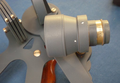 The frame is certainly austerely functional and the limb has a radius of 142 mm against that of the drum sextant, which is about 170 mm, while its weight with its permanently mounted telescope is 860 G, compared to, say, the 1300 G of an alloy-framed Tamaya with a star telescope mounted. There are only three index shades and two horizon shades, quite enough for most purposes. The mirrors, which are interchangeable, both measure 59 x 29 mm. This is not the advantage that it might seems, as the horizon mirror is fully silvered, that is to say, there is no plain glass half, the horizon being viewed directly rather than through a thickness of plain glass. The edge can be fully protected with paint, whereas the junction between the silvered and unsilvered parts of the traditional mirror was always a weak point for sea water to attack the silvering. However, each half of a Galilean telescope “sees” only its own field of view: if half of the objective lens is covered over, half of the field of view is lost. With the traditional arrangement of mirrors, some of the light from the index mirror is reflected off the front surface of the plain part of the horizon mirror into the telescope, so that the images of the body and of the horizon to a large extent overlap. In this instrument, with the fully silvered mirror and a Galilean telescope, there is overlap of about one sun diameter (about half a degree) as opposed to about two and a half diameters for a full glass, and this may make for difficulties for an inexperienced or occasional observer.