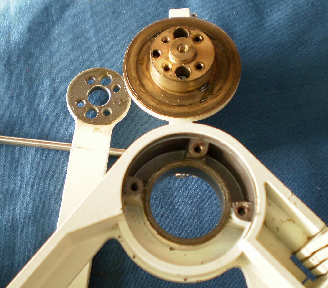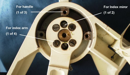 Removal of the handle reveals a sextet of screw heads beneath. Two pass through the bearing (strictly speaking, the journal) and attach the index mirror mounting to the deep flange on the other side. Four attach the index arm to the journal (journal : the part of a shaft that is enclosed by a bearing). Removing these allows the journal to be withdrawn. The fit is necessarily a very close one and care has to be taken that it does not capsize and jam. Figure 4 shows the bearing dismantled and it is seen that the large parallel bronze journal runs directly in the frame. There is no provision for taking up wear as none is to be expected in a slow-moving part with such large bearing surfaces.