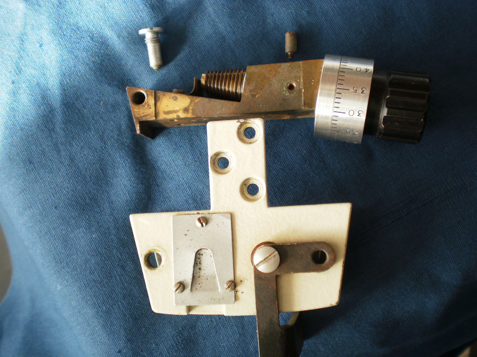 The release catch is a cranked metal stamping. When it is operated, its end bears on a pin that passes through an oval hole in the enclosure casting into the swing arm, and presses the swing arm down agains a leaf spring that lies between the swing arm and the bottom of the casting. Upon detaching the casting from the index arm, some more details are revealed (Figure 6).