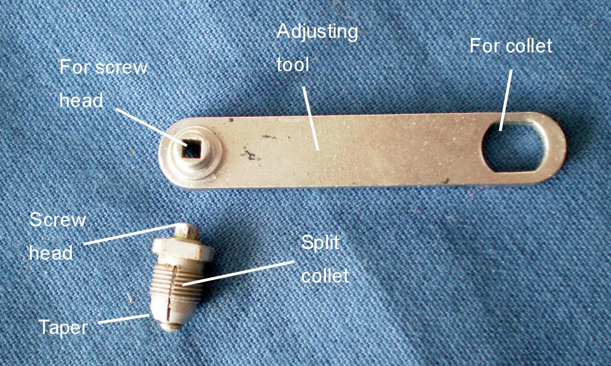 Though the adjusting screws for the SNO-T and the Freiberger Skalensextant are superficially similar, anyone who treats them the same is in for an unpleasant surprise; and jammed, broken or stripped screws are a common occurence. In these sextants, the collets, which have coarse threads on the outside are not split, and the adjusting screws pass through threaded holes both in the collet and in the back of the bracket. The screws are locked by unscrewing the collet a little. The screw can be withdrawn by rotating the collet a little to find the position at which the screw is unlocked. Any attempt to fully unscrew the collet before the screw has left the thread in the mirror mounting inevitably causes damage. Some early Trommelsextants may have the same arrangement, so it would pay to proceed with caution if backing off the nut by half a turn does not release the adjusting screw.