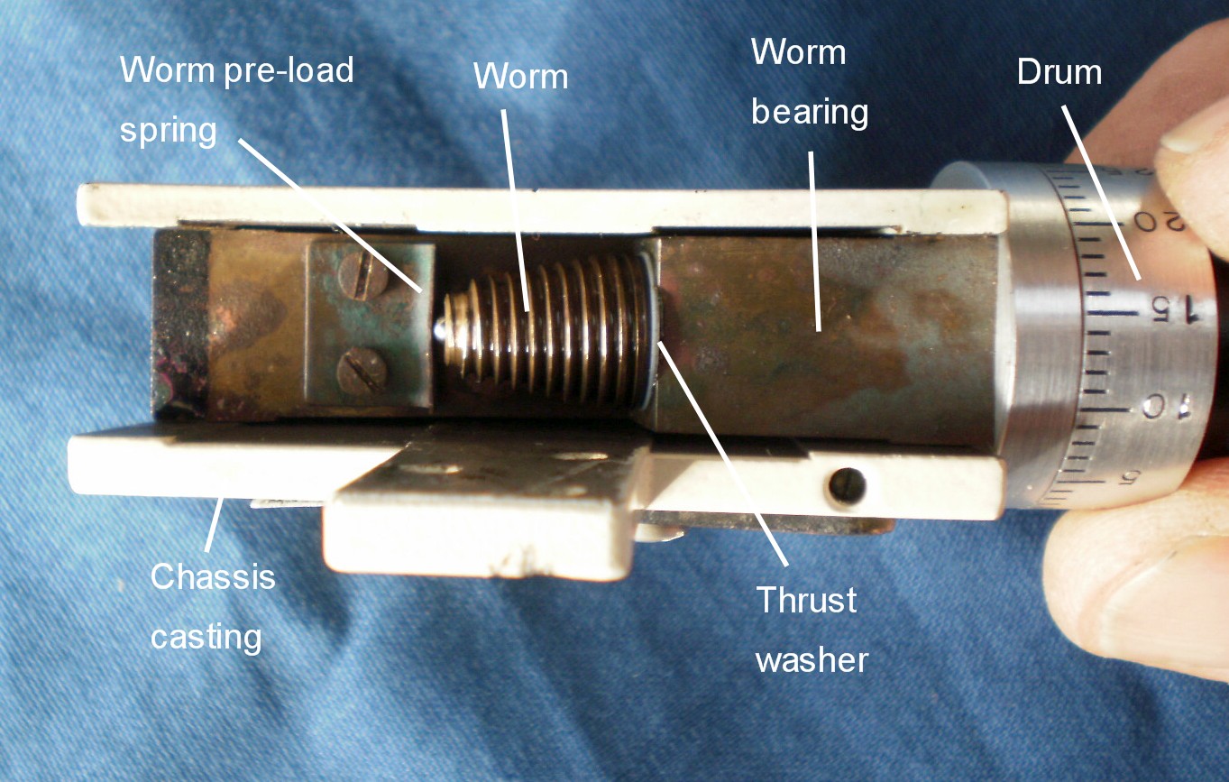The bronze swing arm rotates about a pin for an axis (seen in Figure 5) and has a long and substantial bearing for the worm shaft. End float of the latter is prevented by trapping the worm between an L-shaped phosphor-bronze pre-load spring and a PTFE washer. The aluminium alloy drum, divided into minutes and attached to the knob by two screws, was heavily corroded and pitted in my example, and I was obliged to make a new one. The knob is retained on the worm shaft by a grub screw and a pin nut. Figure 7 perhaps allows a better appreciation of the internal workings of the release catch and swing arm.
