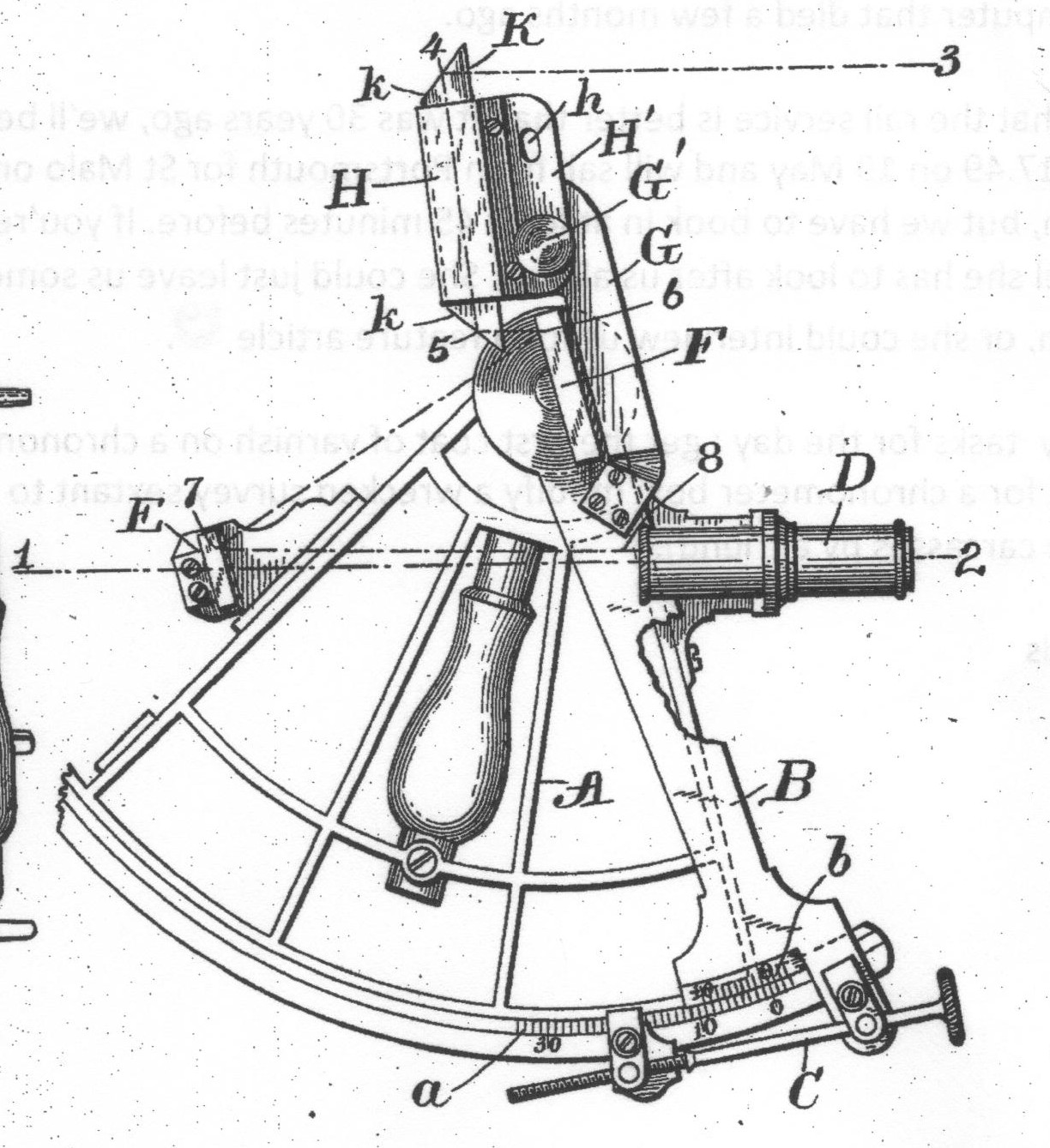 If the angle between the horizon in front of the observer and the horizon behind him can be measured, then dip can be deduced directly, as it is half the value of that angle.This is not a new problem. In 1900, John Blish of the United States Navy applied for a patent for an attachment to add to a normal sextant. The patent can be viewed on Google Patents by searching for Patent number 714,276. Figure 2 shows one of the patent drawings.