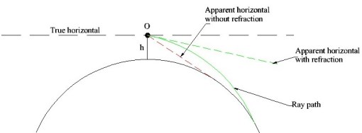 For those not familiar with the concept of dip, Figure 1 shows that the height, h, of the eye of an observer O affects the apparent horizontal. This is shown in dotted red. But, especially close to the horizontal, light does not travel in straight lines, because the density of the atmosphere decreases with height. Generally the light path, shown in full green, is bent or refracted so that it is convex upwards. This has the effect of making the distance to the horizon greater and the angle between the apparent and true horizontals, the dip, smaller. However, when atmospheric conditions are abnormal it can be much greater or even reversed. For a much fuller treatement of dip and its abnormalities, see http://mintaka.sdsu.edu/GF/explain/atmos_refr/dip.html.