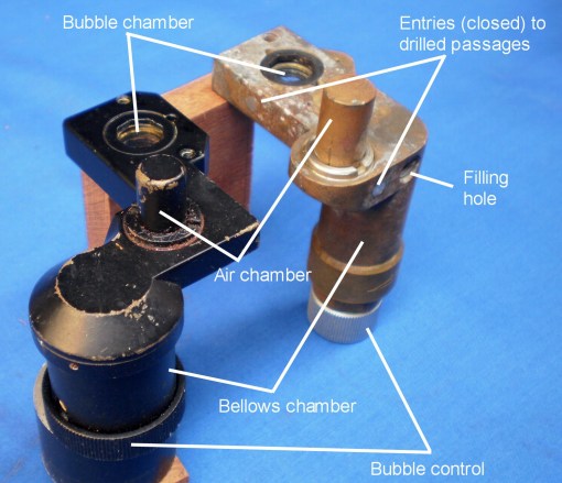 When the adjusting screw is rotated anti-clockwise, the bellows are compressed and the pressure in A rises. It is transmitted via the drilled passage 1 to the bubble chamber and, if the bubble lies correctly within the triangle etched on the glass at the front of the unit, air is forced into the air chamber and the bubble size decreases.  Conversely, if the pressure in A is caused to fall by rotating the adjusting knob  clockwise, air is drawn from the air chamber, via passage 2, into the bubble chamber. The correct position for the bubble when observing is shown by a central square. In use, to adjust the bubble size, the sextant is tilted backwards to bring the bubble within the area marked by the triangle. After long storage, the bubble chamber may be nearly empty but nearly always this seems to be that the air and the fluid , alcohol in the SOLD, redistribute themselves, rather than being due to leakage. In this case, most of the fluid can be shaken out of the air chamber by repeatedly flicking the wrist with the air chamber upper-most. The air in the fluid chamber can then be displaced into the air chamber by patiently rotating the control knob slowly back and forth with the triangle up, until the bubble reaches the required size.