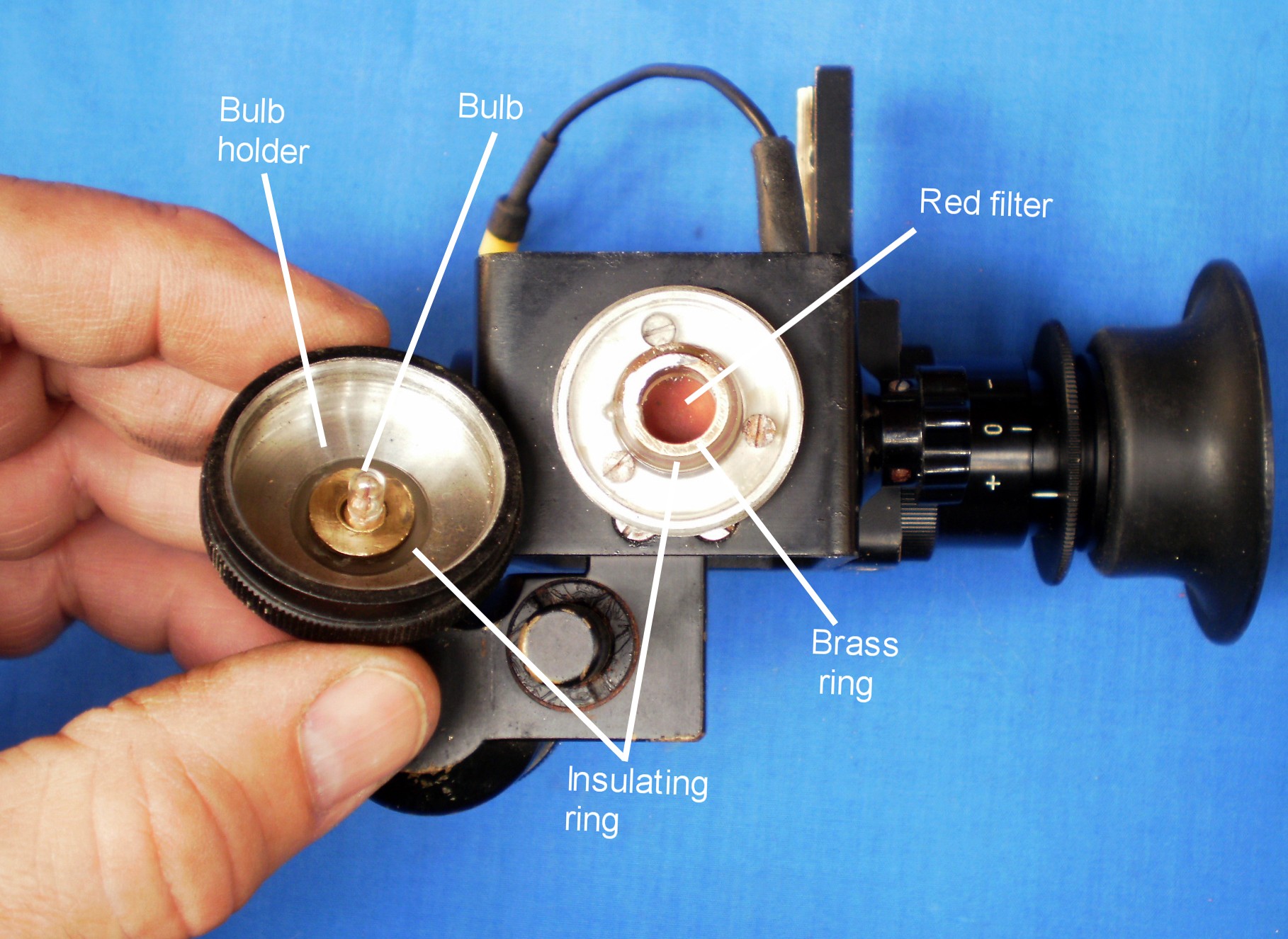Power for the lamp comes from the battery handle of the sextant. Current flows through the plug and lead to the wiper on the variable resistance (black wire, Figure 2) and thence to the brass ring (red wire) in the top of the attachment. The ring is insulated from the body of the attachment and, when the bulb holder is screwed home, another, brass ring, threaded for the bulb and insulated from the bulb holder, makes contact to carry the current to the bulb. The return current is carried from the central contact of the bulb to the body of the bulb holder, through the body of the attachment and thence, via the mounting fork, to the body of the sextant.