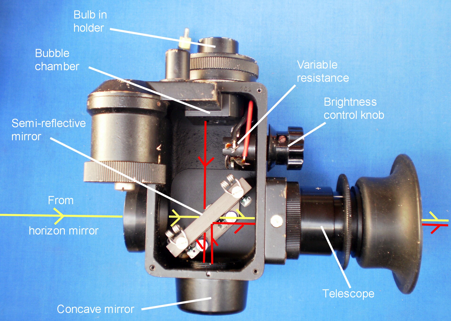 Figure 2 shows the ray path through the attachment. Rays from the observed body are deflected by the horizon mirror of the sextant  into a window in front and pass through a semi-reflective mirror into a 3 power Galilean telescope. The bubble formed in the bubble chamber above lies at the focus of a concave mirror below, so that rays forming the image of the bubble emerge from the mirror parallel, and the image of the bubble appears, like the observed body, to be at infinity. These parallel rays are deflected by the semi-reflective mirror (in fact a piece of plane, unsilvered glass) into the telescope. Thus, the image of the bubble is superimposed on that of the body and it lies to the observer simply to bring them into coincidence, a by-no-means-easy task.