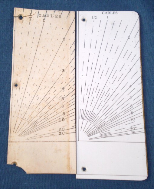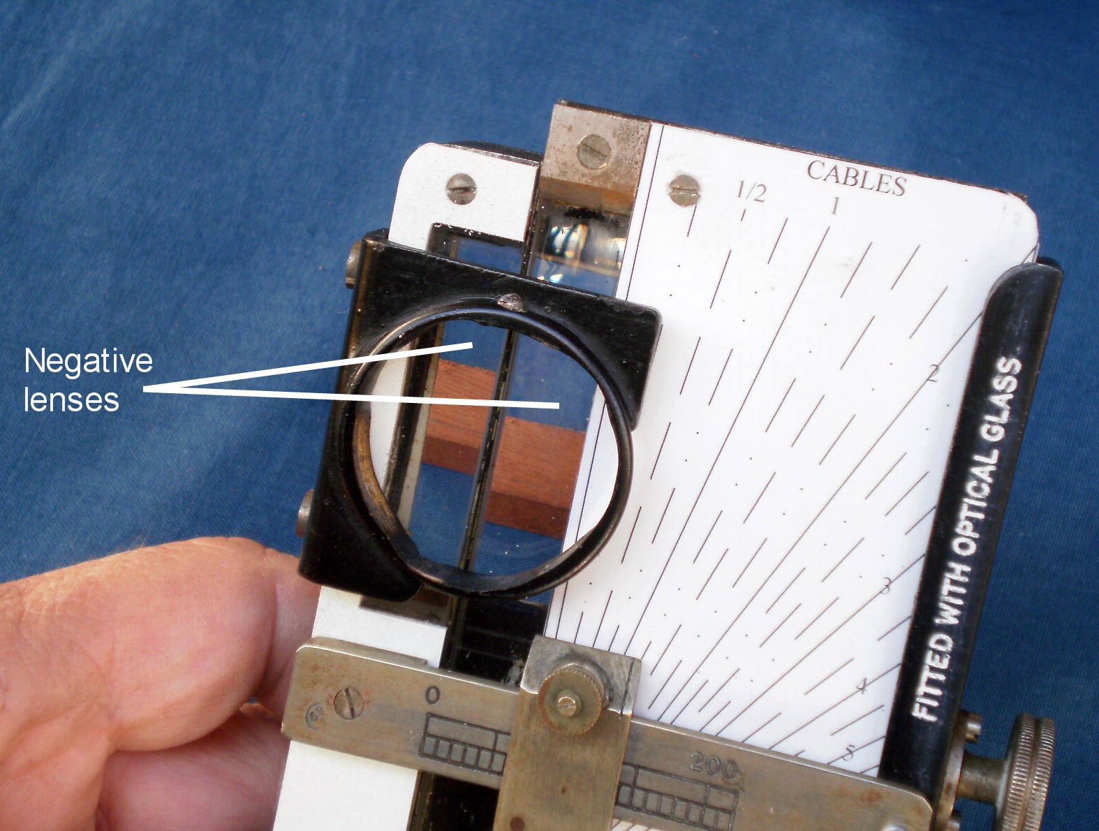 When sailing in company with other ships, as for example, in a convoy, or when maintaining a safe distance when rounding a danger, it was useful to know the distance of one’s ship from the other objects. Until the advent of radar, a variety of distance meters was used. The most obvious is perhaps the sextant, likely to be found aboard every ship of any size. If some dimension of the object is known, like height of the mast above the waterline, and the vertical angle subtended by the dimension is measured, its distance can be calculated, but every self-respecting set of nautical tables had a table of “Distance by vertical sextant angle” to obviate calculation. A variety of distance meters was invented in the late nineteenth century to eliminate even the incovenience of looking up tables by giving a direct reading of the distance once the mast height had been set.
