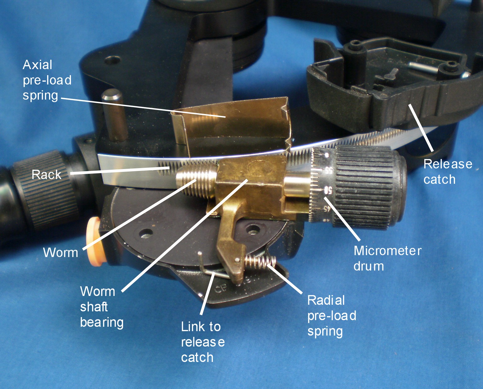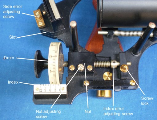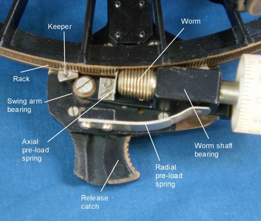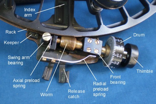 Figure 7 shows the micrometer mechanism in close-up. The worm is conical so that the end of the shaft that bears the drum is further away from the frame, allowing the use of a larger drum than would have been the case had a cylindrical worm been used. End play in the worm shaft bearings is taken up by the axial preload spring that bears on the rear end of the shaft. A radial pre-load spring keeps the worm in engagement with the rack and a keeper on each end of the expanded lower end of the index arm prevents the mechanism from lifting away from the front of the limb. The worm in its bearings is attached to a swing arm that rotates about a bearing. When the release catch is operated, the worm swings out of engagement with the rack in the plane of the sextant frame, allowing the index arm to be swung rapidly to any desired position. When the catch is released, the worm swings back into engagement with the rack under the influence of the radial pre-load spring, ready for fine adjustments to be made via the worm. As will be seen, this mechanism was later simplified, probably to reduce production costs, before a final burst of simplification in the Navistar Professional model.