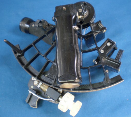 The sextant is quite easy to use and is no doubt very rigid for its weight of 1600 G (3.5 lb), but the placing of the handle at 120 degrees means that when it is turned to view the micrometer drum it is out of balance. The telescope has a fairly limited field of view and the micrometer is difficult to read. Instrumental accuracy was given as better than 20 seconds. I doubt that this sextant found much favour with traditonalists, but by the time my specimen was sold (1988) sextants were already falling into disuse.