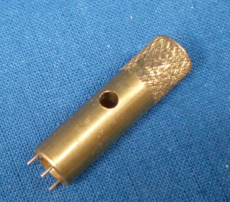 The scales were illuminated by a system of light guides within the black plastic covering to the lower end of the index arm. The source of the light was simplicity itself, being simply a wire bulb-holder that also embraced the battery. An orange cap when depressed pushed the positive end of the battery against the central contact of the bulb and thus compeleted the circuit (Figure 22). A ridge on the cap latched against an internal cut-out to prevent the whole falling out, but slots cut in the cap to allow the ridge to spring into the cut-out had sharp corners which in my specimen have already led to a crack forming, and I anticipate having to machine a brass replacement some time in the future. Meanwhile, I have drilled a hole at the end of the crack to reduce stress concentration.