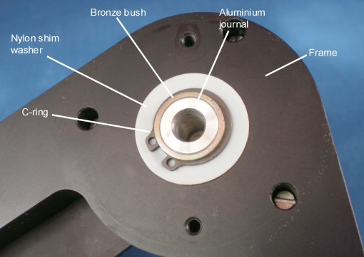 The index arm journal took the form of a bronze bush surrounding a boss extending from the bottom of the index mirror bracket and the bronze-coated journal ran directly in the frame, being secured by means of a C-ring and a nylon washer (Figure 20).