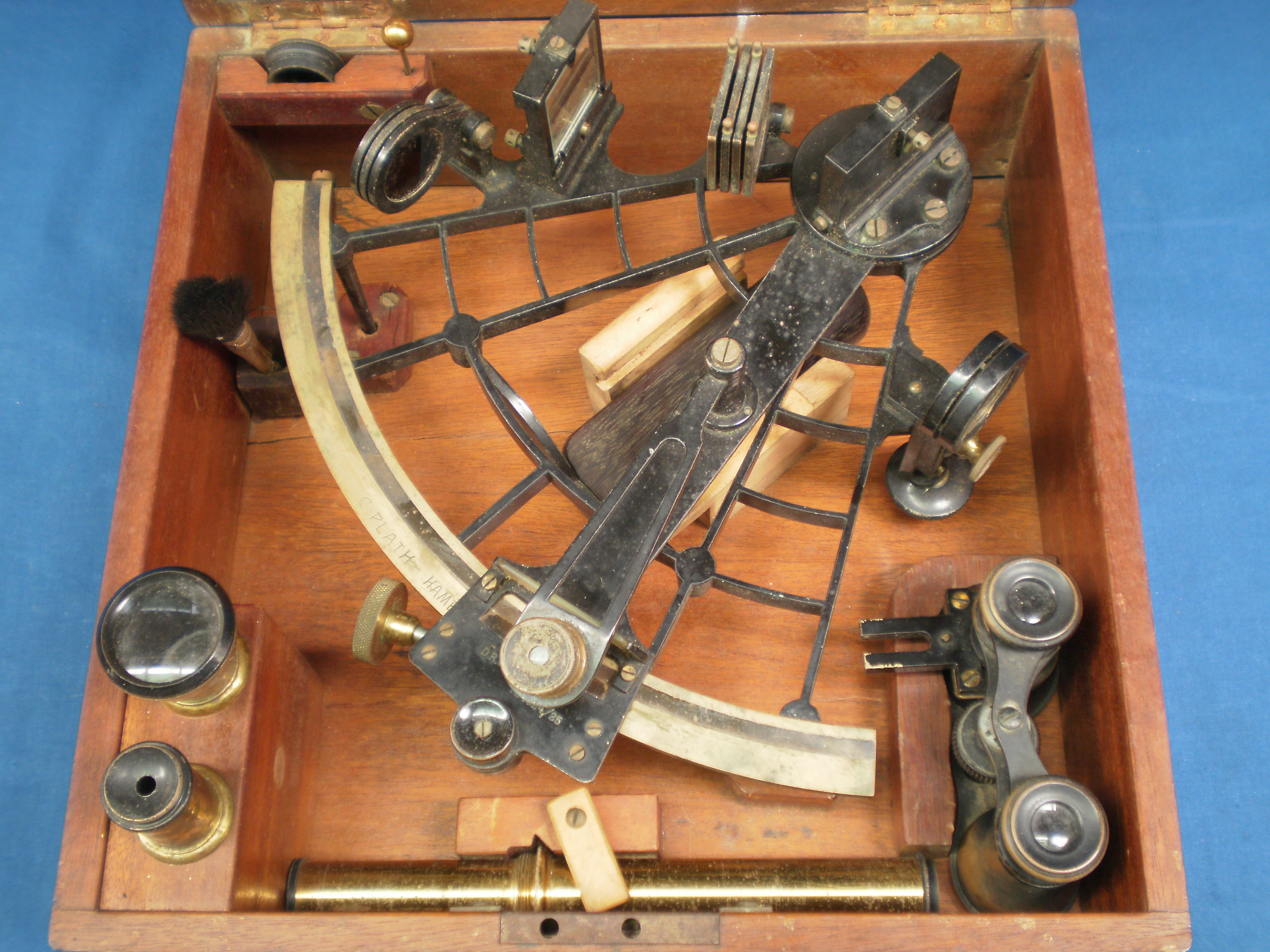 Carl Christian Plath took over the business of David Filby in 1862. Philby was an instrument maker, but just as with clock and chronometer makers, he did not actually make the sextants he sold. However, Plath bought a dividing engine from Repsold in about 1865 and his own first sextants probably date from shortly after that date. As with most early instruments, few of them survive. It seems that they were regarded simply as tools of the trade by their users and most often unsentimentally discarded when their owners retired. No doubt, some were lost at sea and others found their way to attics and basements, only to be thrown out as unidentifiable junk after the owner’s death. The earliest Plath sextant that I have dates from about 1909.