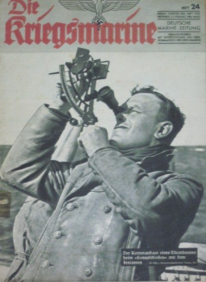 While the standard sextant had a bronze frame with bronze mirror brackets and weighed with its telescope a hefty 1.9 kg (4.19 lbs), the wartime standard sextant had an aluminium alloy triangulated frame (Figure 8) with alloy brackets weighing a mere 1.2 kg (2.65 lbs). Once the very expensive moulds for the frame and brackets had been made, many thousands of the parts could be turned out rapidly by the pressure die-casting process; and the serial numbers increased by about 4,500 between mid 1942 and the end of the war in mid 1945. While aluminium alloy frames were perceived to be inferior to bronze ones by mariners, in fact they are rather more rigid and stable and at least as corrosion resistant. Figure 9 shows the instrument in use during wartime as illustrated by the magazine Die Woche for 14th April 1943. The 0.7 kg reduction in weight makes using this model of sextant a pleasure and it has not been my experience that a lighter sextant is more difficult to use when there is a strong wind.