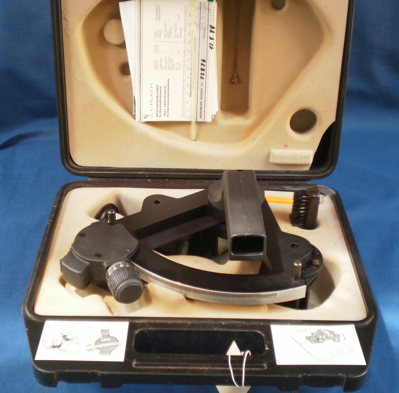 In 1977, Plath introduced their Navistar professional sextant, just in time for it to be made obsolete withn a few years by the advent of the Global Positioning System. The frame was a hefty triangle of aluminium alloy 14 mm (0.55 in) thick. While this undoubtedly made it cheaper to manufacture, it had the unfortunate corollary that there was nothing by means of which one could pick it up, except for the handle, so it was provided with a light moulded plastic case in which it sat handle uppermost. This led to a further difficulty: because it was not provided with legs, this is the only place that it can be put down and then only with the index set at – 6 degrees. Figure 16 shows a front view of the instrument and Figure 17 shows it in its case. What appear to be stubby legs on the rear of the limb serve only to act as stops for the index arm.