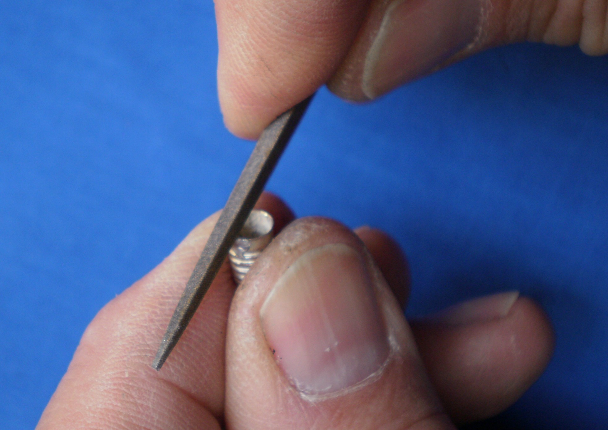 A notch must now be filed or sawn into the edge of the base to accept one of the LED wires. Figure 4 shows this being done with a triangular Swiss file, sometimes called a “three-square file” for an unknown reason. A junior hacksaw blade will do the job just as well.
