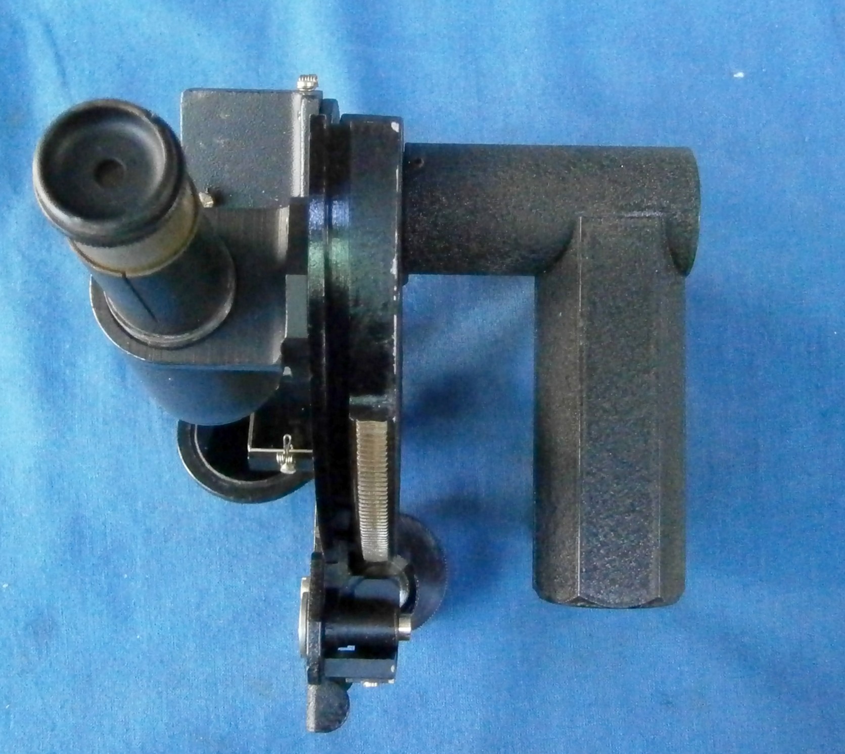Apart from its small size, there are one or two other unusual features such as its handle and its micrometer drum, which spans two degrees. Figure 1 shows a front view of the un-restored instrument and Figure 2 gives a rear view. You can get a magnified view of all figures by clicking on them. Return to normal by using the back arrow.