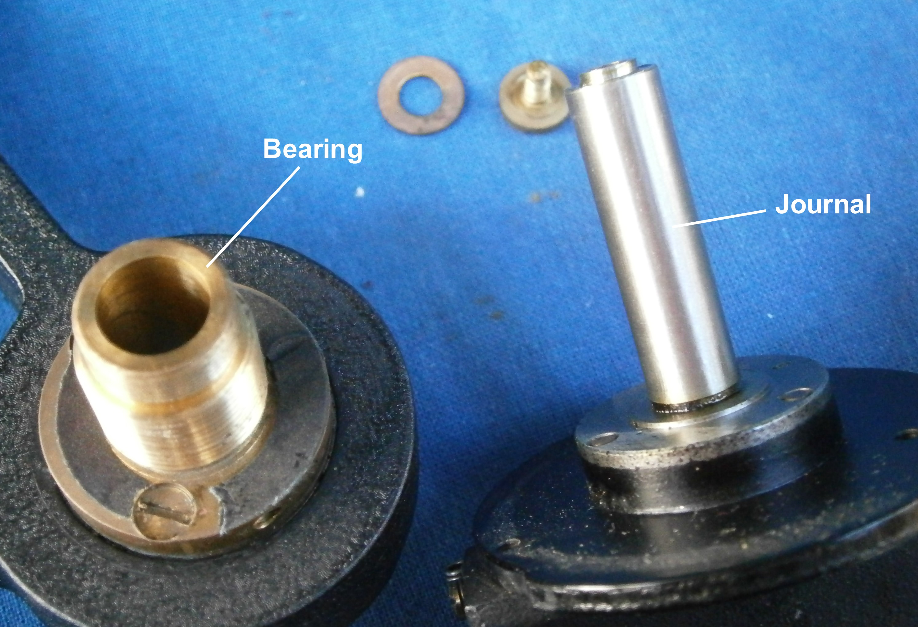 The vast majority of sextants ever made had tapered index arm bearings, but as micro-finishing of plain parallel bearings advanced in the second half of the twentieth century, C Plath and Observator made use of the new technology in their sextants. As Figure 6 shows, Poulin followed suit in this sextant. The parallel steel journal rotates in the bronze bearing (strictly speaking, the bearing is the enclosure in which the shaft or journal rotates), and is secured against axial movement with a phosphor-bronze spring washer and a brass screw. No provision is made for adjustment as no wear is to be expected in the slow-moving, lightly-loaded bearing.