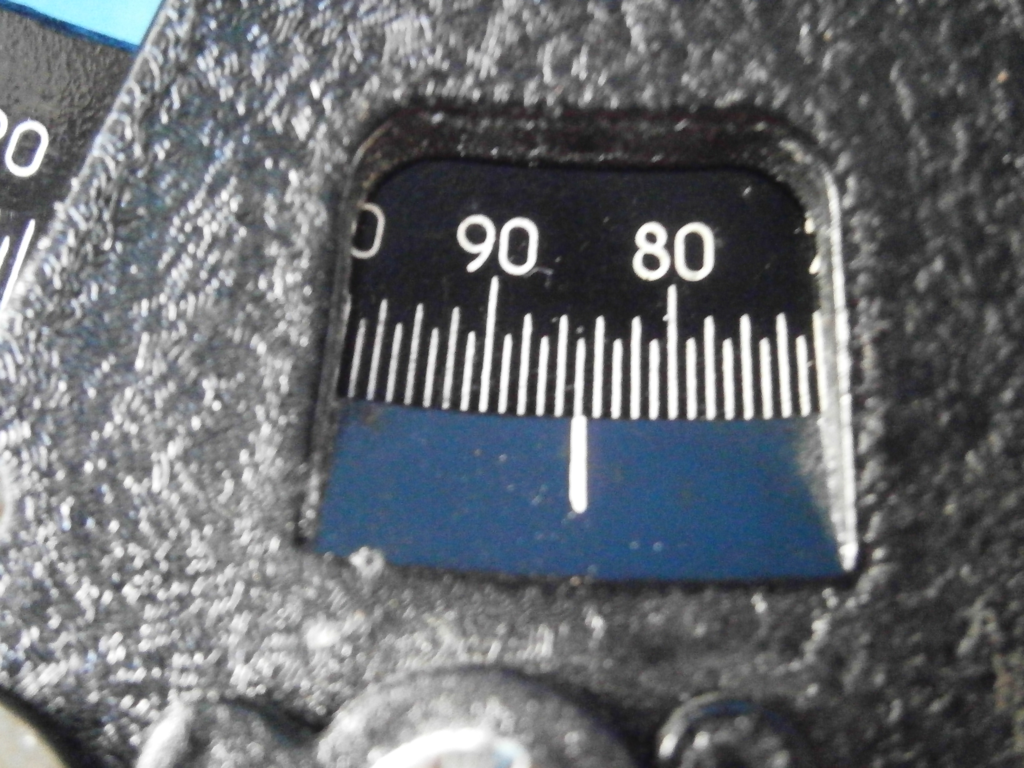 Since one rotation of the worm with its attached micrometer drum advances the reading through 2 degrees, the drum is divided 0 to 60 minutes twice with subdivision to minutes (Figure 9). The main scale on the limb and the micrometer drum are divided to single degrees and minutes respectively, with alternate tick marks being long (Figure 10). At first sight, this gives the impression that half-degrees and minutes are being shown and it might have been easier to read had the normal practice been followed of making the 5 tick mark longer than the others.