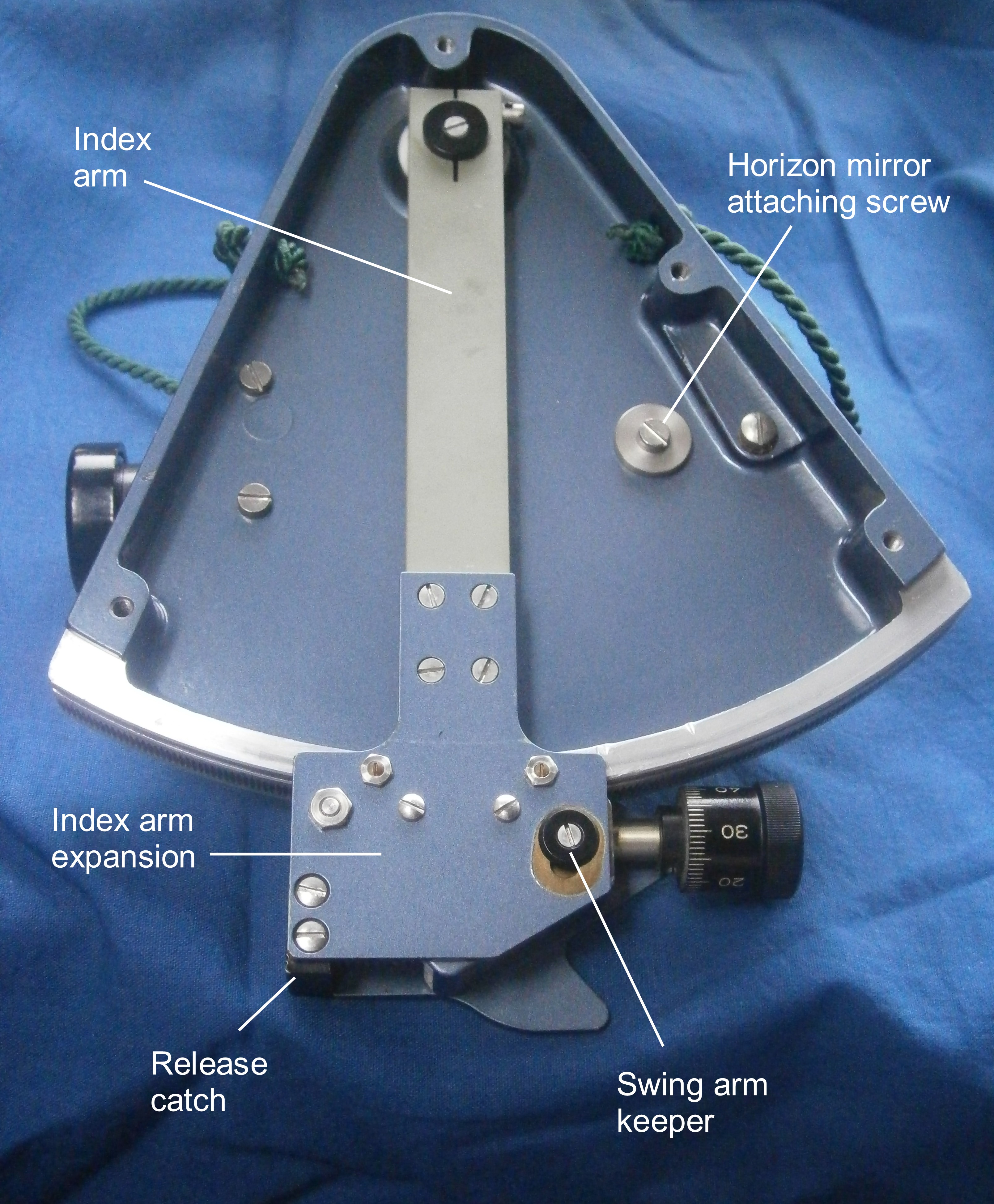 The index arm is in two pieces: a stout rectangular bar attached to the index mirror bearing at the top; and a plate that I have christened the index arm expansion at the bottom. This plate carries the micrometer mechanism. I have labelled the screw for attaching the horizon mirror and the swing arm keeper in Figure 3 for future reference below. Also seen are the two stout screws that attach the telescope to the frame.