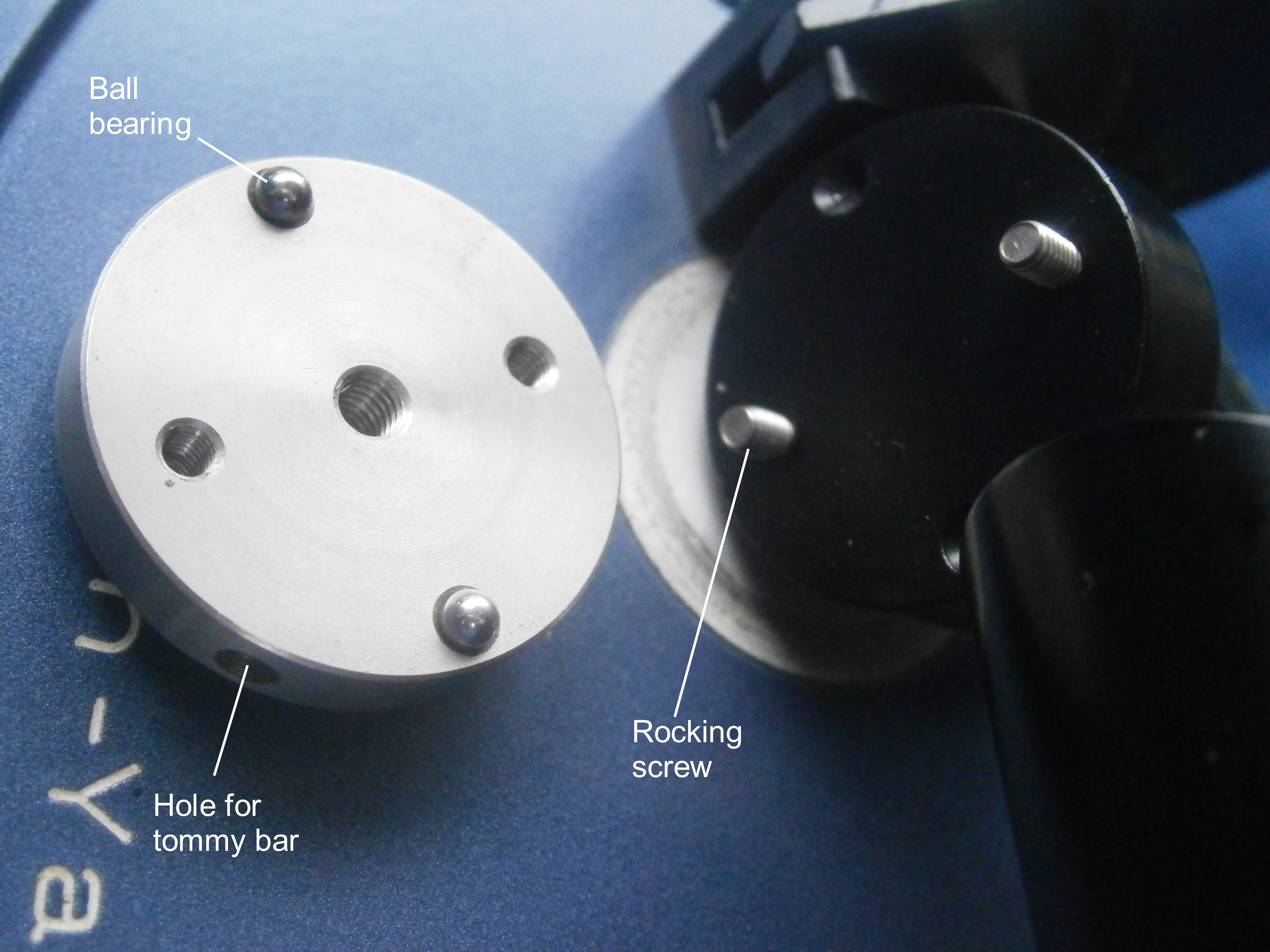 The anatomy of the index arm bearing is revealed in Figure 4. A micro-finished journal runs in a parallel bearing machined directly into the frame, with two PTFE washers acting as spacers and also taking any minor thrust forces that may arise. A flange above the journal carries the index mirror in its bracket, while a spigot below attaches the index arm. Figure 5 shows how the upper end of the index arm is split, with a pinch screw to close it around the spigot. This allows adjustment of the mirror in the horizontal plane as well as axial adjustment to take up any axial movement in the bearing.