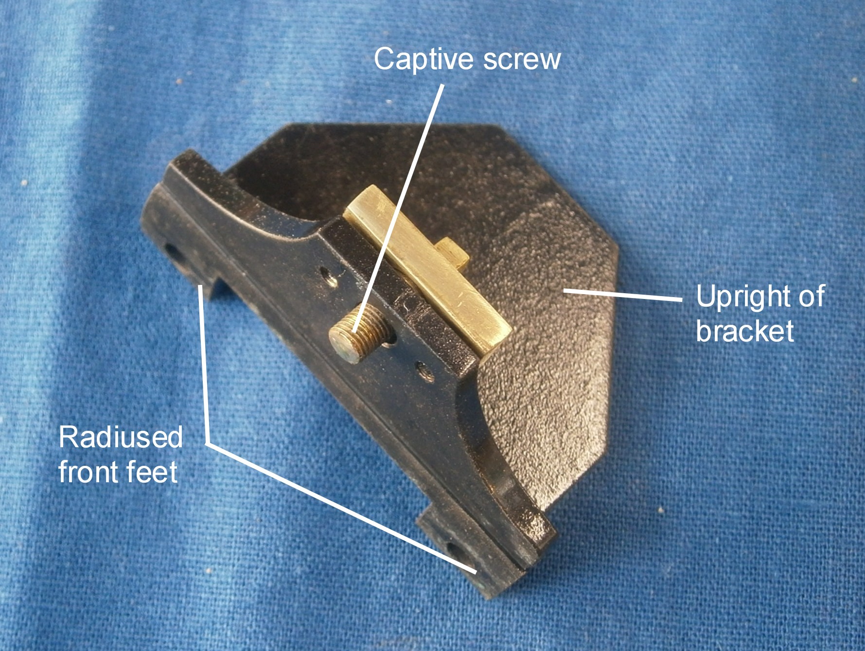 The mirror is adjusted for perpendicularity by rocking the whole bracket on the two radiused front feet by means of an adjusting screw held captive in the horizontal part of the bracket and engaging with a threaded hole in the top of the index arm (Figure 5). The screw can be locked by tightening the screws that pass through the brass clamp bar that holds the screw captive. An earlier (and simpler) method was to have the hole in the foot tapped for a screw, the end of which simply bore on the face of the index arm, though there was a tendency for the thread to strip in clumsy hands.