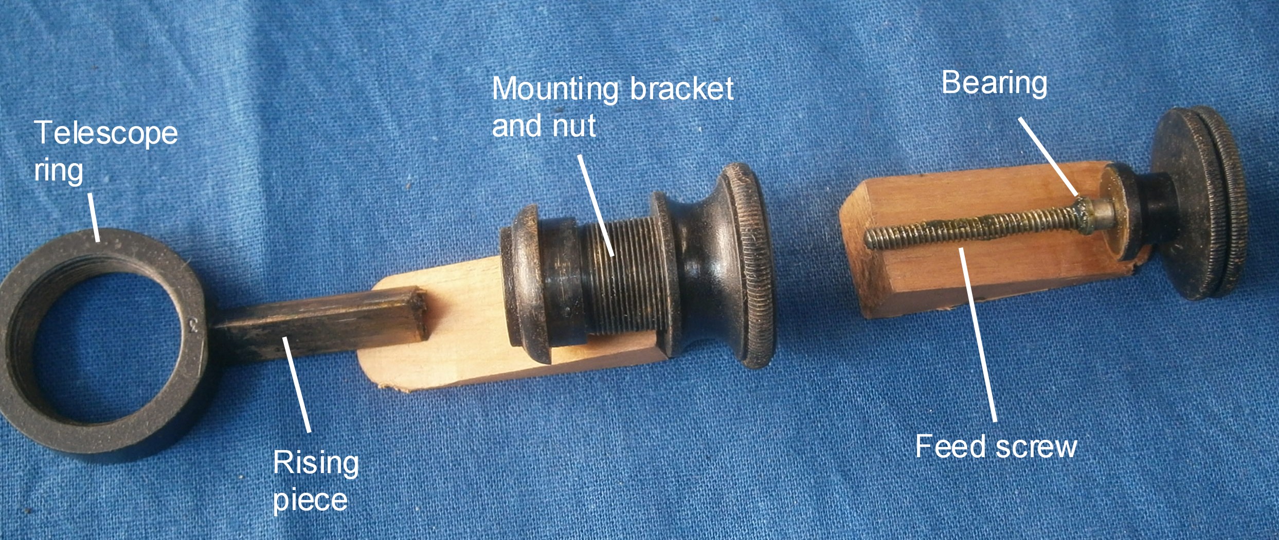 The telescope mounting again achieves a good result at the expense of complexity (Figure 9). The rising piece is triangular in section and is close-fitting in a triangular hole in a bracket that passes through a hole in the telescope frame and which is secured by a large knurled nut. A countersunk screw passes through the frame into the bracket to secure it against rotation. A large knurled adjusting thumb screw is held captive in the bracket and its thread passes up the middle of the rising piece to make it rise or fall.