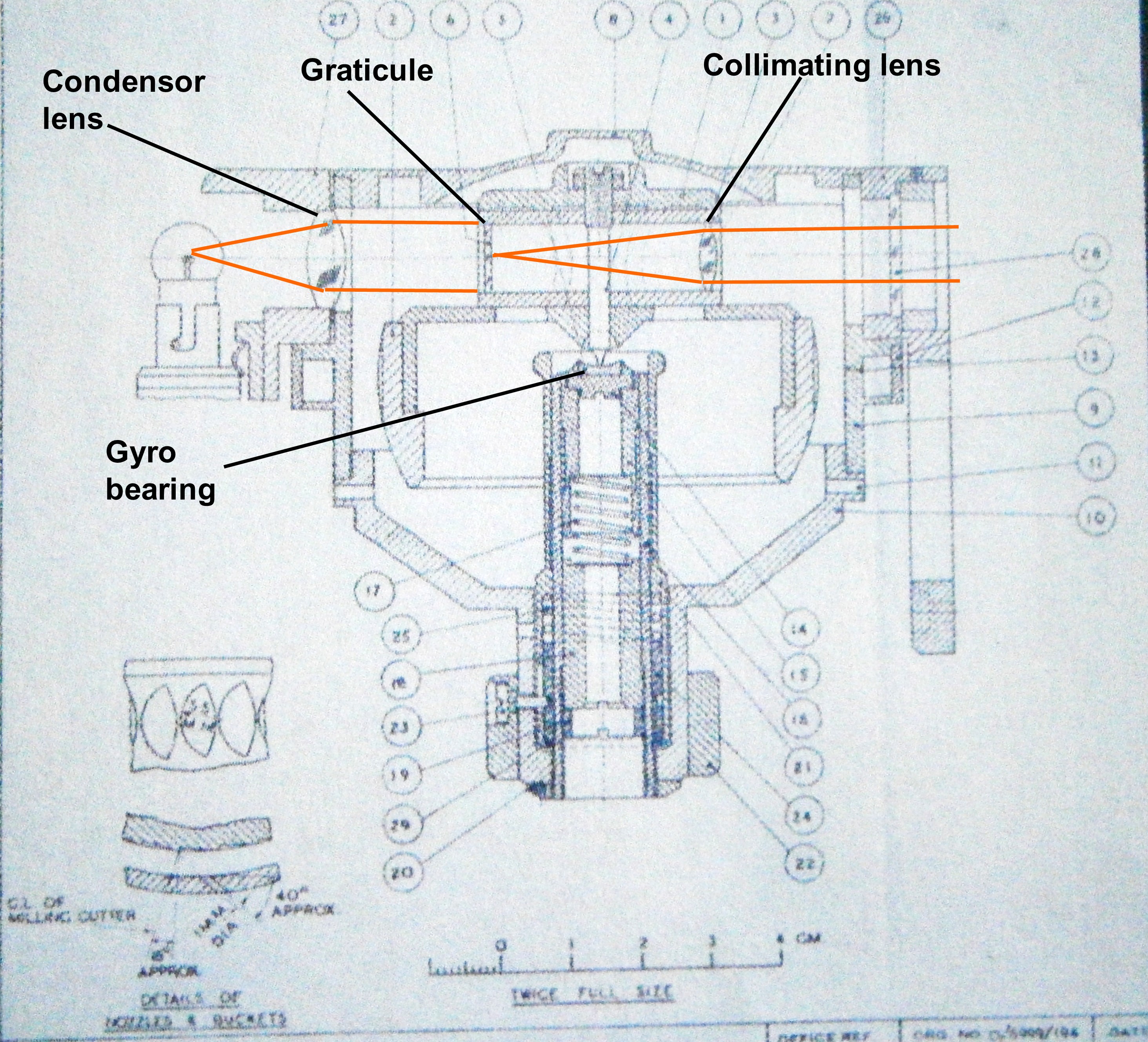 Figure 12 is of another drawing from the British 1945 report, showing the full light path. After being collimated at the rotor the image of the graticule is, I think, reverted by a pair of lenses, one applied to the face of a 90 degree prism and the second beyond a fixed mirror. This second lens appears to be at the focus of a further collimating lens that brings the rays parallel again, to be viewed in a Galilean telescope. (I am not confident that I have correctly described the function of the lenses between the two collimating lenses. If any reader can enlighten me further I should be glad to hear from them in the “Comments” section.)