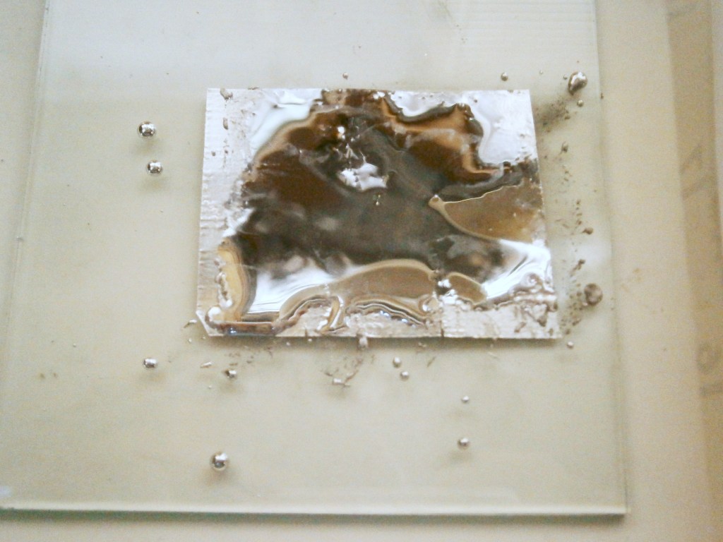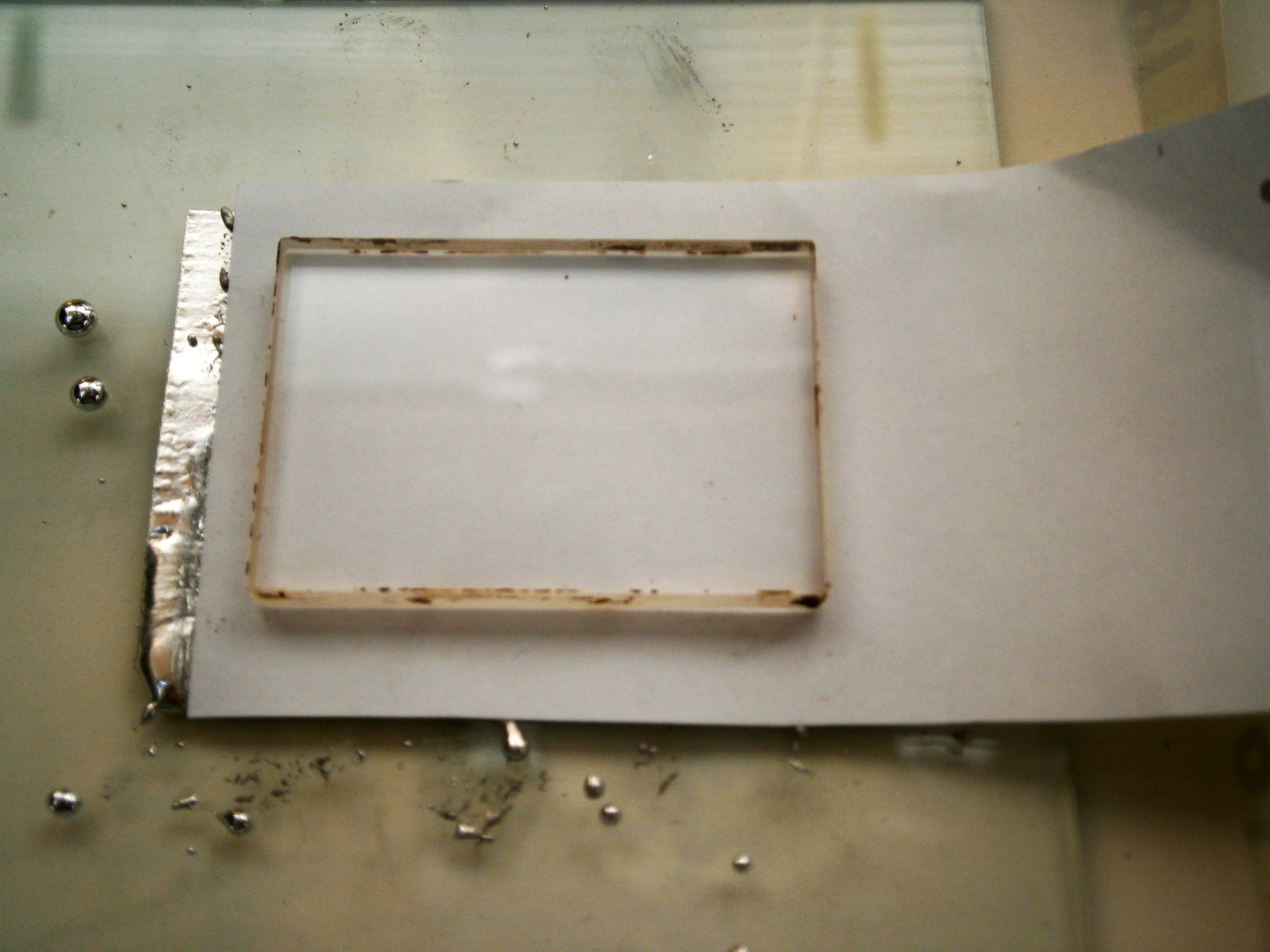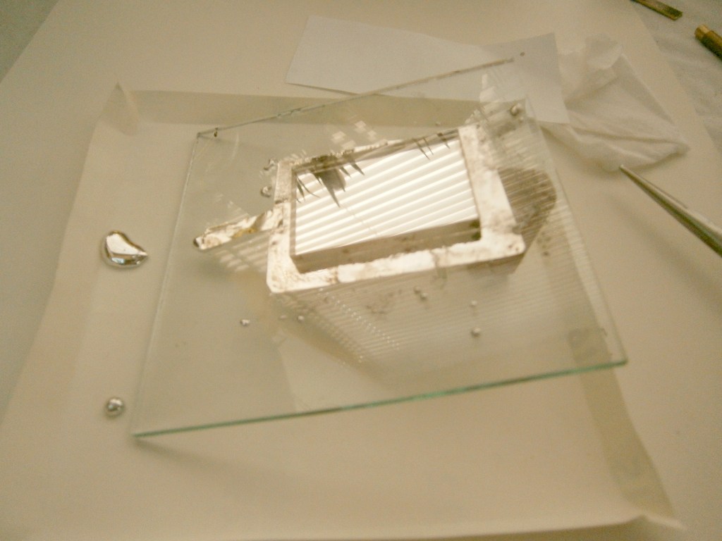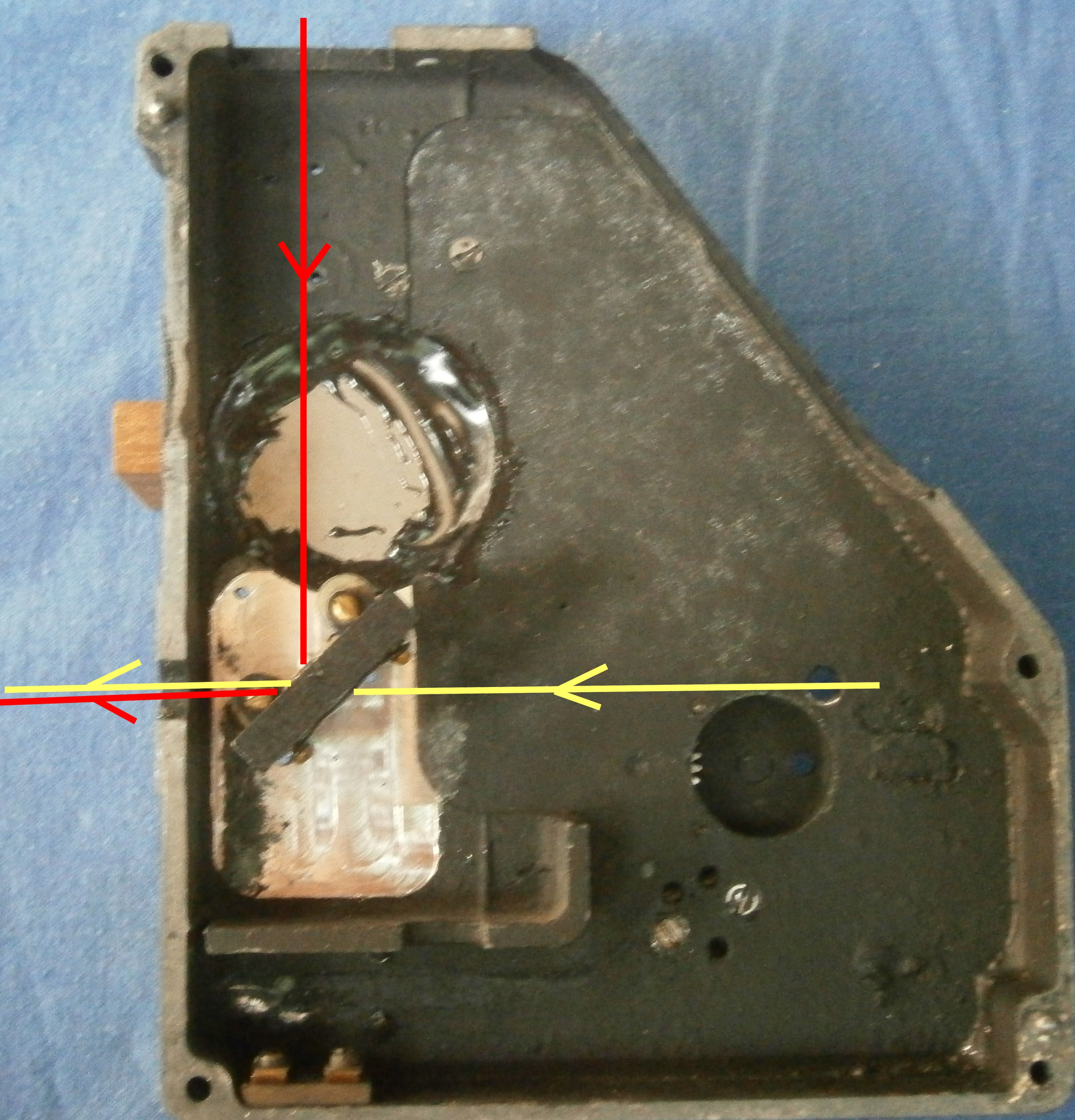 Upon further exploration of the excrescence at the top it turned out to contain a right angle prism to divert light entering it directly downwards into the instrument. A variable polaroid filter can be swung to filter the incoming light. I suspect the fitting was canabalised from something like a WWII drift meter. A half-silvered mirror with a silvered aperture of only 18 x 7.5 mm diverted the down-coming rays into the eye hole, joining the rays from the observed body, as in a normal sextant.