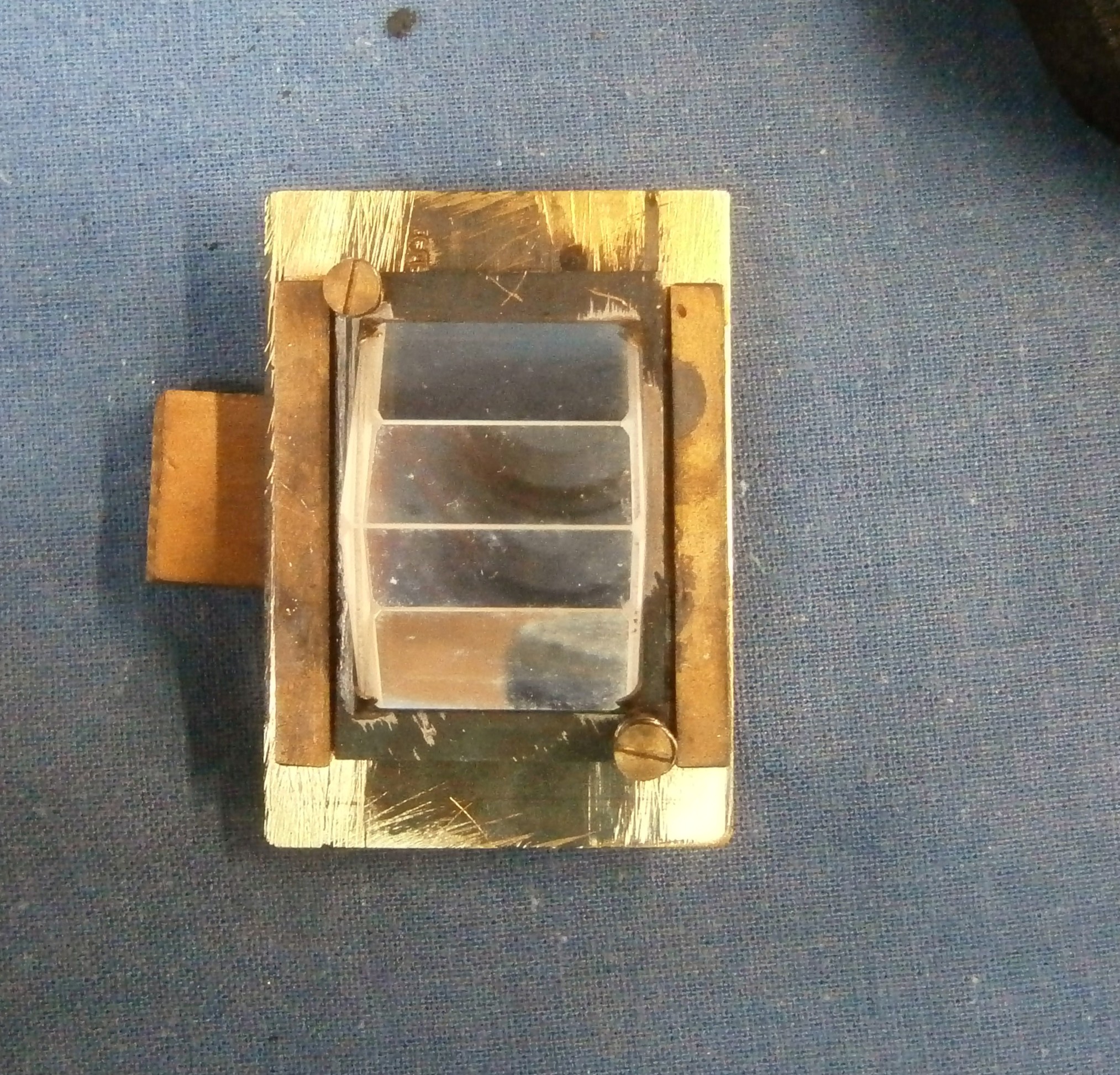 Figure 4 shows the prism mounting from the side. The prism is cemented to a back plate which is held against three points by two springs. The three points are a fixed nipple and two screws for adjusting index and side error.