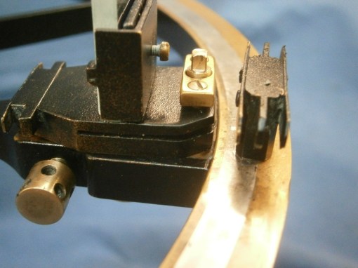 The arrangement for the tangent screw is rather unusual The screw is held captive in a bearing which is attached to the clamp, the underside of which may be seen in Figure 5 above. A curved tongue extends from the clamp and fits closely in a groove machined in the lower end of the index arm. The base of the nut retains it in place. The nut is attached to the index arm so that when the clamp is operated and the screw turns, the index arm is rotated and slides smoothly along the stationary tongue.