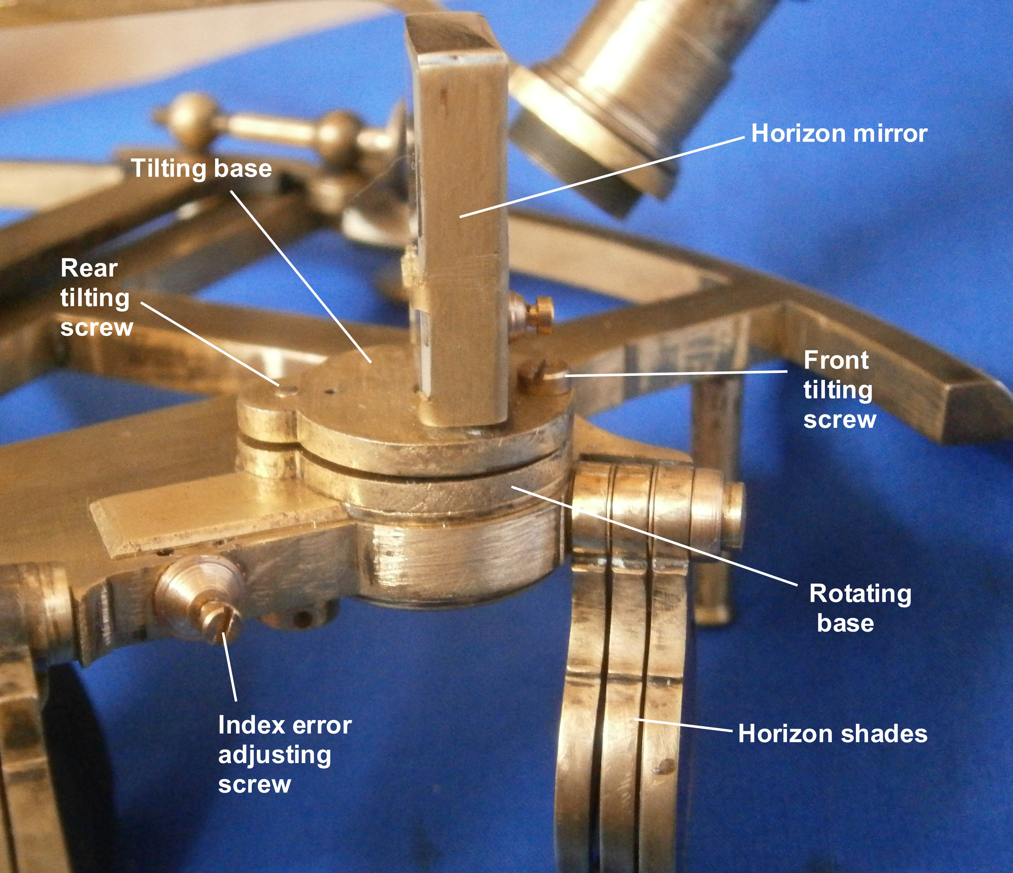 No provision is made to adjust perpendicularity of the index mirror, rather, it was made correct in the first place, a practice followed by only a minority of late nineteenth and twentieth century sextants. However, there is provision to make the horizon mirror parallel to the index mirror to adjust out side error, and to rotate the horizon mirror to adjust out index error (Figure 7).