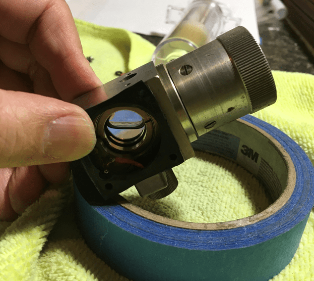 If you don’t see a bubble or any fluid sloshing around when looking into the lens housing, then you likely will need to fill the bubble chamber. While the repair manual for the Kollsman instrument does seem to imply that a set of fixtures with valves, reservoirs, and temperature control are required, it’s actually a simple procedure to do on a typical hobby bench.