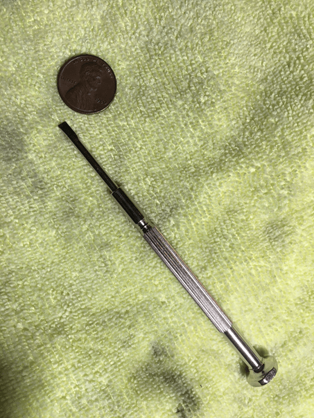 A tight-fitting screwdriver blade to the screw’s slot is, of course, preferred. Take care working with these screws. Note that some instruments have screws that have been painted over – you will have to break the paint away from the screw slots to seat the screwdriver properly. An eyeglass screwdriver did this with little fuss.